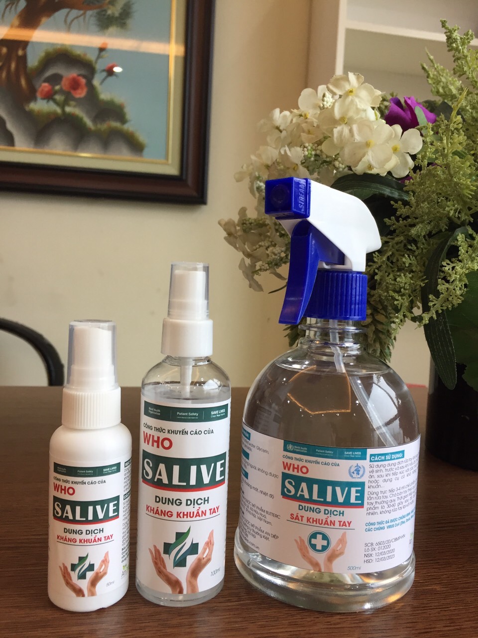 Dung dịch sát khuẩn tay Salive được sản xuất theo công thức của WHO. Được cấp phép bởi Sở Y tế Hà Nội. Sản phẩm được đóng trong các bình xịt 500 ml,100 ml, 50