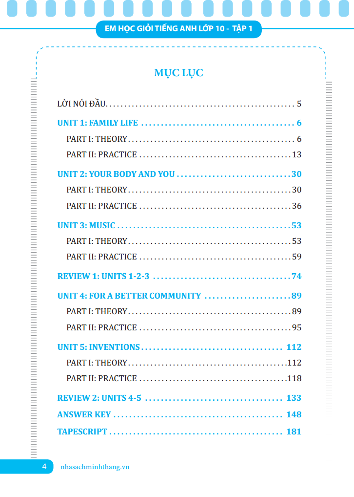 Bộ sách được chia thành 2 tập: Tập 1: từ Unit 1 đến Unit 10 Tập 2: từ Unit 11 đến Unit 20 Với mỗi bài học, chúng tôi đều biên soạn theo ba phần kiến thức cơ bản: Lý thuyết, thực hành ngôn ngữ và thực hành kỹ năng.