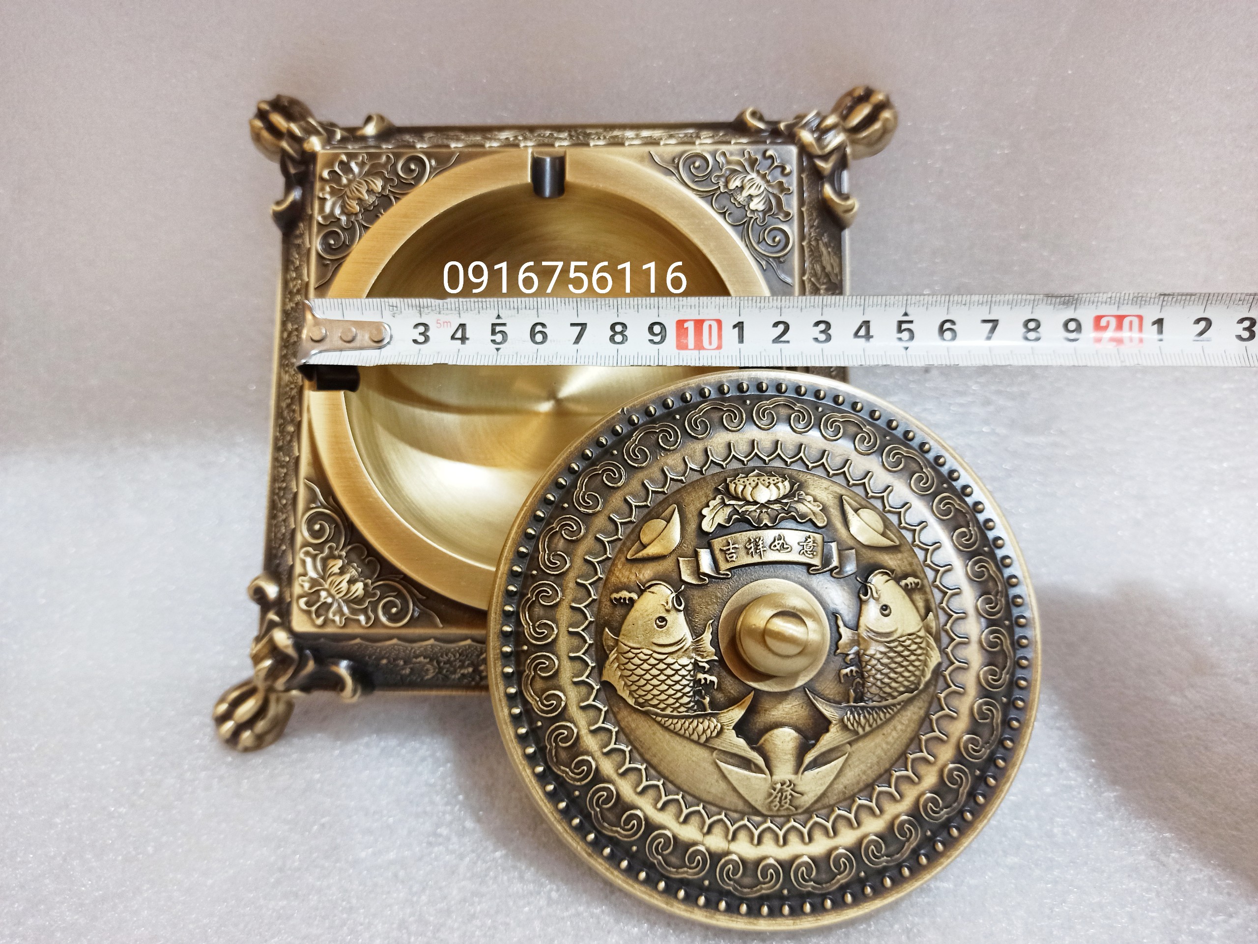 - Kích thước 20x20x9.5 (cao đến chỏm nắp), - Chất liệu: đồng - Nắp rời, sang trọng, lịch sự, phù hợp với mọi không gian (phòng khách, cơ quan, phòng làm việc)