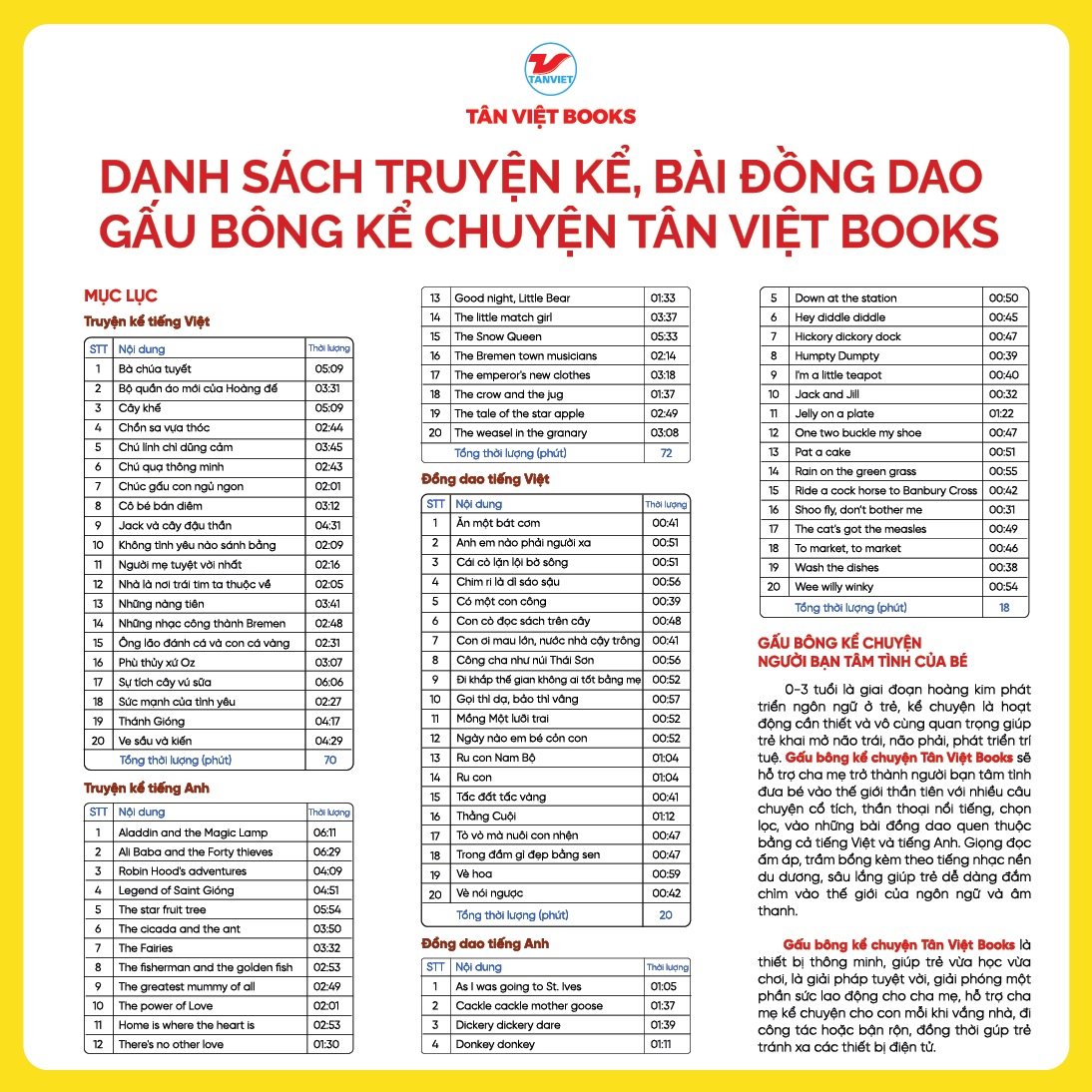 Gấu Bông Kể Chuyện Tân Việt Books gồm 80 nội dung (20 câu chuyện tiếng Anh, 20 câu chuyện tiếng Việt, 20 bài đồng dao tiếng Anh, 20 bài đồng dao tiếng Việt), sẽ là giải pháp để: