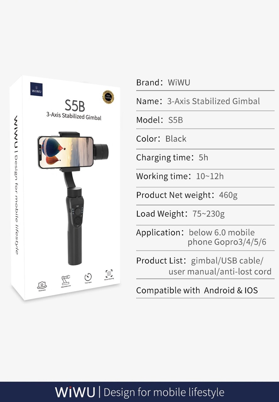 Gậy chống rung Wiwu 3-Axis Stabilized Gimbal S5B Thương hiệu: Wiwu Áp dụng cho điện thoại thông minh dưới 6 inch. Gopro 3/4/5/6 tương thích với Android và iOS, bộ chuyển đổi camera hành động có kích thước tương tự Thời gian sạc: 5 giờ Thời gian làm việc: 10-12 giờ Màu sắc: đen Chất liệu: ABS Gimba ổn định 3 trục ổn định hơn không rung lắc Đáp ứng các góc chụp rộng, chụp ngang & dọc Pin tốt thời gian sử dụng lên tới 12h Nhận dạng và theo dõi khuôn mặt/ đối tượng thông minh Hỗ trợ chụp toàn cảnh 180 độ/ 330 độ