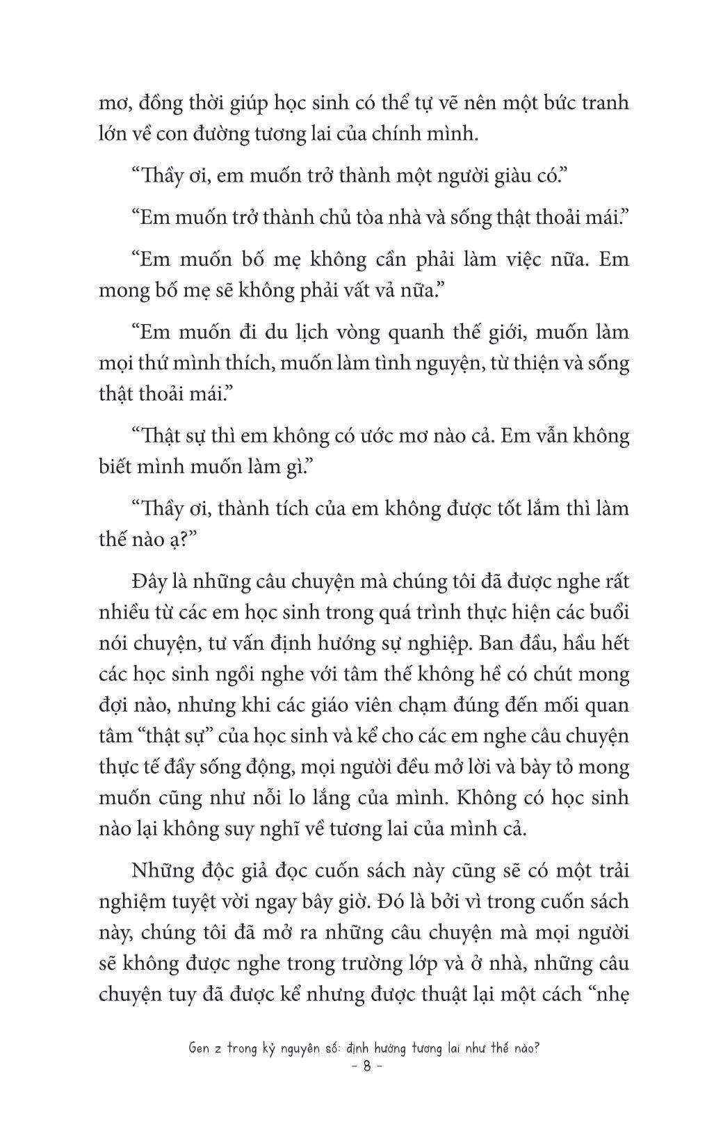 Trong cuốn sách Gen Z trong kỷ nguyên số: Định hướng tương lai như thế nào?, tác giả Yun Kyu Hoon thông qua những cuộc nói chuyện với hơn 330.000 thanh thiếu niên tại các trường trung học sẽ chỉ cho bạn thấy cách làm thế nào để vạch ra một con đường sự nghiệp tương lai đúng đắn dù bạn đã có đam mê hay chưa tìm ra. Việc định hướng này rất quan trọng, đặc biệt trong tình hình cả thế giới đang đối mặt với đại dịch covid và sự thay đổi chóng mặt do nền công nghiệp 4.0 mang lại. Những tư duy nào nên có, những nghề nghiệp nào nên được ưu tiên, những kỹ năng nào cần đào sâất cả đều đang chờ bạn lật mở cuốn sách này để khám phá.