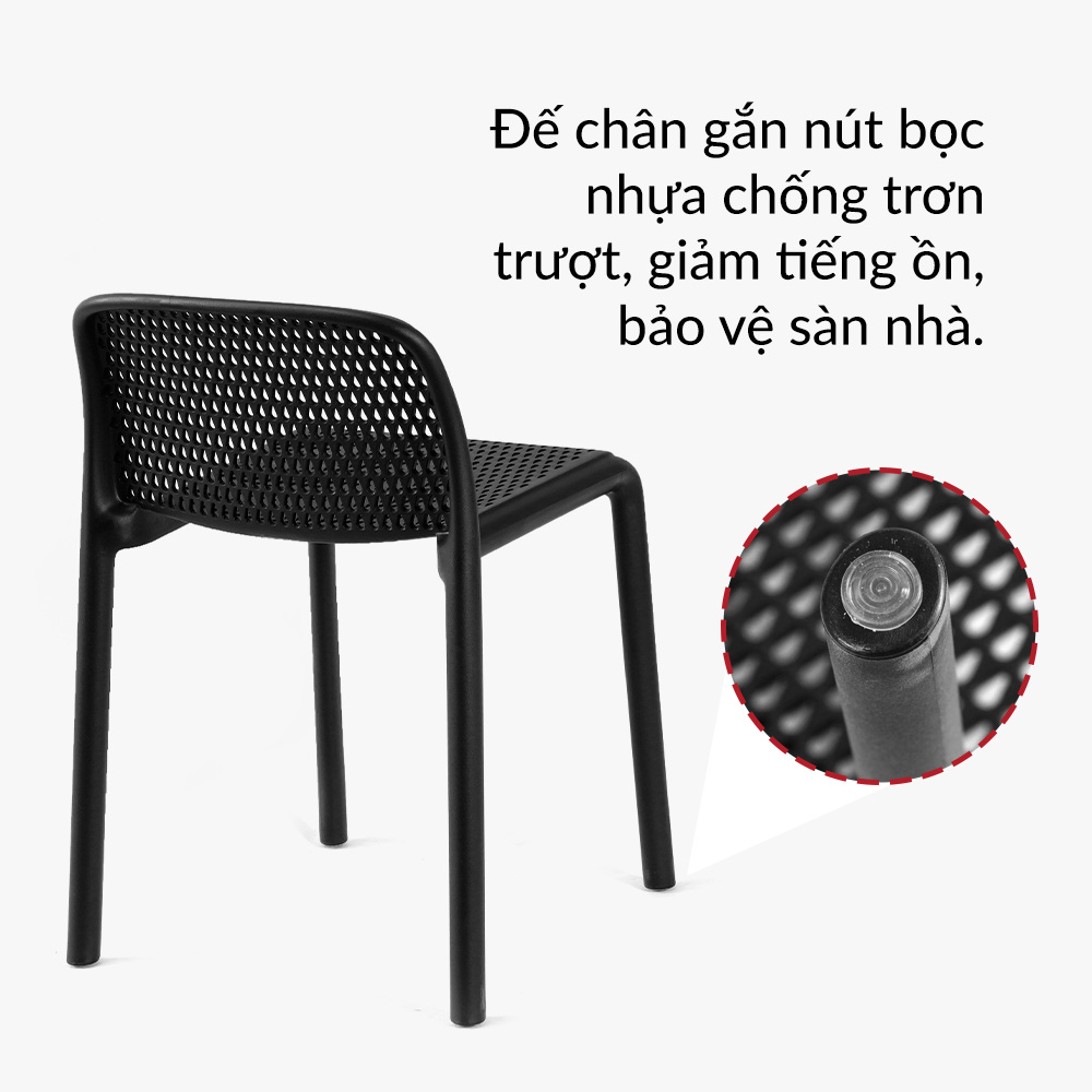Nhựa PP đúc cao cấp mang đến độ bền và độ dẻo dai cao, chịu được tải trọng nặng Thiết kế lưng ghế thấp, lưng tựa và mặt ghế đục lỗ thoáng khí, tránh đọng nước Chân ghế hình ống liền mạch, chắc chắn nhưng vẫn thanh mảnh với góc bo cong mềm mại.