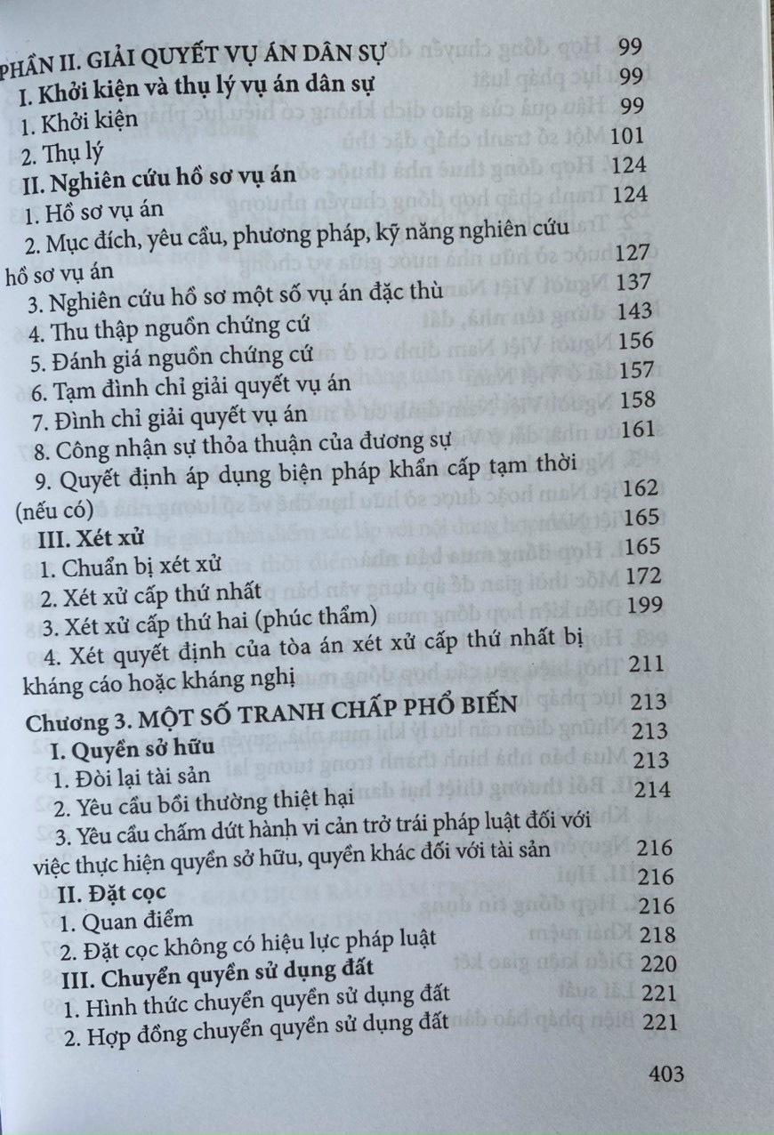 Giải quyết vụ việc dân sự NXB: Lao Động Tác giả: TS. Nguyễn Quang Hiền Sách khổ: 14.5x20.5cm Số trang: 406 LỜI GIỚI THIỆU     Pháp luật dân sự là công cụ pháp luật hữu hiệu nhằm thúc đẩy các giao dịch dân sự, tạo môi trường thuận lợi cho sự phát triển kinh tế xã hội, đặc biệt là trong việc xử lý các quan hệ pháp luật dân sự tranh chấp. Trong thực tiễn thụ lý và xét xử hiện nay cho thấy, việc giải quyết quan hệ pháp luật dân sự tranh chấp thường gặp một số khó khăn bởi do chưa có quy định của pháp luật hoặc mới có luật khung, chưa có tính định lượng cụ thể, tính ổn định không cao, các quy phạm pháp luật còn mâu thuẫn, chồng chéo và vẫn còn có những sai sót. Bên cạnh đó, Bộ luật Tố tụng dân sự năm 2015 còn quy định tòa án không được từ chối giải quyết vụ việc dân sự vì lý do chưa có điều luật để áp dụng, tòa án phải áp dụng tập quán, áp dụng tương tự pháp luật, áp dụng các nguyên tắc cơ bản của pháp luật dân sự, án lệ, lẽ công bằng để giải quyết vụ việc. Do đó, việc nghiên cứu vấn đề giải quyết quan hệ pháp luật dân sự tranh chấp một cách có hệ thống và toàn diện để làm sâu sắc thêm các vấn đề lý luận, thực sự đang là chủ đề thu hút, chú ý của các nhà nghiên cứu cũng như những người hoạt động thực tiễn trong quá trình áp dụng pháp luật của giai đoạn cải cách tư pháp và xây dựng nhà nước pháp quyền ở nước ta hiện nay.      Cuốn sách “Giải quyết vụ việc dân sự” đề cập và lý giải ở mức độ nhất định về những vấn đề nêu trên, cung cấp những kiến thức xã hội, pháp luật và thực tiễn, đề cập nhiều vấn đề mới về cách tiếp cận và quan niệm, cơ sở, tính chất và phạm vi. Tuy nhiên, việc giải quyết quan hệ pháp luật dân sự tranh chấp là vấn đề rộng lớn, phức tạp, đa dạng và nhạy cảm, cho nên nhiều vấn đề cần được tiếp tục nghiên cứu, trao đổi và tranh  biện trên diễn đàn khoa học pháp luật. Hy vọng rằng, cuốn sách sẽ đáp ứng được phần nào nhu cầu của bạn đọc và sẽ là tài liệu tham khảo dành cho những người quan tâm.      Tuy đã cố gắng, nhưng cuốn sách vẫn không tránh khỏi một số hạn chế và những thiếu sót nhất định, mọi trách nhiệm thuộc về tác giả. Xuất phát từ quan điểm không quá cầu toàn và cố gắng tối đa để tránh những khiếm khuyết, chắc chắn rằng, với sự cảm thông và những ý kiến đóng góp, phê bình của bạn đọc cuốn sách sẽ được hoàn thiện hơn trong lần tái bản sau.       MỤC LỤC                                                                                                                                                                                                                                        Trang                                                                                                           Chương 1 QUAN HỆ PHÁP LUẬT