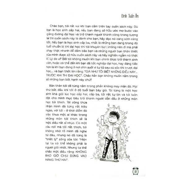 Thông tin chi tiết Mã hàng 9786043905137 Tên Nhà Cung Cấp Phụ Nữ Tác giả Đinh Tuấn Ân NXB Phụ Nữ Việt Nam Năm XB 2023 Ngôn Ngữ Tiếng Việt Trọng lượng (gr) 320 Kích Thước Bao Bì 23.5 x 15.5 cm Số trang 306 Hình thức Bìa Mềm   Mô tả sản phẩm Giá Như Tôi Biết Những Điều Này Trước Khi Thi Đại Học   "Một cuốn sách hay và đáng đọ Đọc để cảm nhận kinh nghiệm, hy vọng của tác giả trẻ với mong muốn cải thiện suy nghĩ sai lầm in sâu trong thế hệ học sinh cũng như phụ huynh."   (Thạc sĩ Nguyễn Ngọc Bích Dung)   "Chào bạn, tôi rất vui khi bạn cầm trên tay cuốn sách này. Dù bạn là học sinh cấp hai, nếu bạn có ước mơ học tiếp lên đại học trong tương lai để trở thành những người thành công thì tôi khuyên bạn ngày lúc này hãy sở hữu cho mình cuốn sách này càng sớm càng tốt. Nếu bạn là sinh cấp ba, nhất là những bạn đang trong độ tuổi chuẩn bị thi đại học thì tôi khuyên bạn không nên đi mà phải chạy thật nhanh để đảm bảo bạn và những người bạn thân thiết của bạn sở hữu cuốn sách này và nghiền ngẫm nó thật kỹ. Lý do ư? Bởi tôi không muốn khi bạn chính thức trở thành sinh viên, hoặc có thể đến khi bạn tốt nghiệp đại học, hoặc khi bạn đang ở nơi chín suối vì tự tử sau khi trượt đại học,à bạn thốt lên rằng: "Giá Như Tôi Biết Những Điều Nàước Khi Thi Đại Học!"