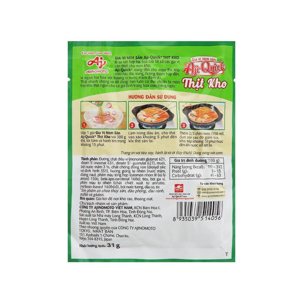 Gia vị nêm sẵn thịt kho Aji-Quick có hương vị đậm đà, thơm ngon từ các gia vị như đường, mắm, tỏi, hành, gia vị 5 gia vị và nhiều loại gia vị khác. Sản phẩm có thể được sử dụng để nêm nếm các loại thịt, tạo ra hương vị đặc trưng của món thịt kho truyền thống.
