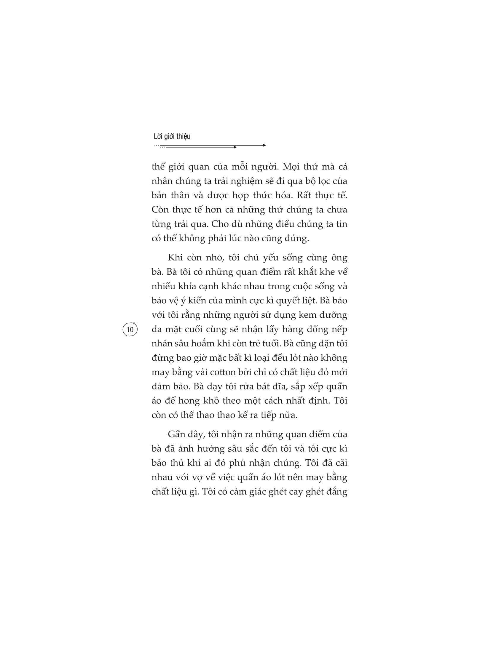 “Bản chất con người vốn hay suy nghĩ. Chính khả năng suy nghĩ đó khiến chúng ta khác biệt với các giống loài khác. Chúng ta nhận thức được việc mình suy nghĩ. Thói quen nhận thức ngày càng phát triển hơn khi chúng ta lớn lên. Chúng ta học hỏi từ cha mẹ. Sau đó đi học, lên đại học, tìm được công ăn việc làm, đọc thật nhiều sách, xem cả tá phim ảnh và kết nối với mọi người. Mỗi một hoạt động này đều vô tình ảnh hưởng đến cách suy nghĩ của chúng ta. Kinh nghiệm nhận thức định hình thế giới quan của mỗi người. Mọi thứ mà cá nhân chúng ta trải nghiệm sẽ đi qua bộ lọc của bản thân và được hợp thức hóa. Rất thực tế. Còn thực tế hơn cả những thứ chúng ta chưa từng trải qua. Cho dù những điều chúng ta tin có thể không phải lúc nào cũng đúng.”