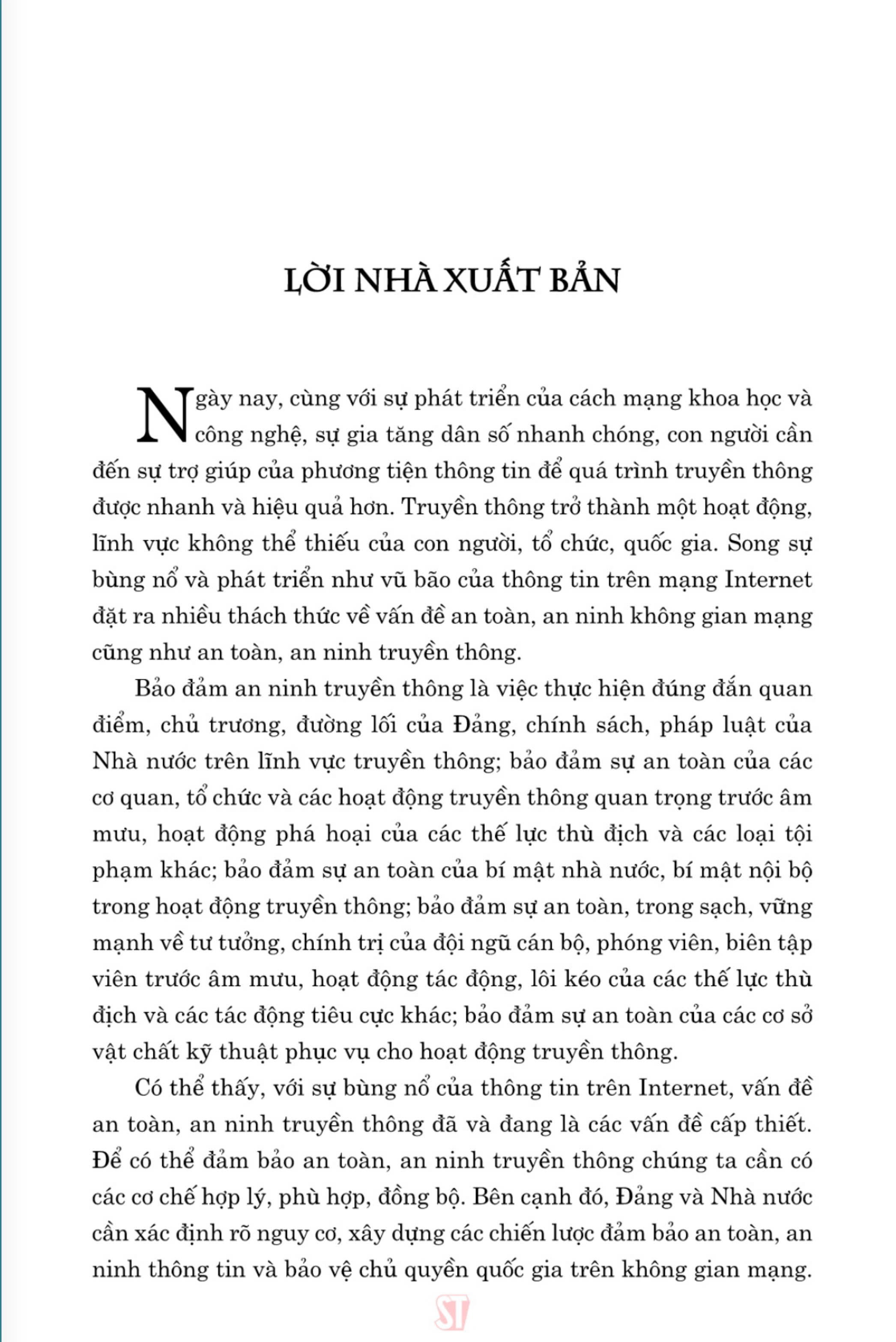 Mặc dù các tác giả và Ban biên tập đã hết sức cố gắng trong quá trình biên soạn, biên tập, song đây là vấn đề còn khá mới, đồng thời liên tục xuất hiện nhiều thủ đoạn tinh vi hơn đe dọa an ninh truyền thông ở trong nước và quốc tế, nên cuốn sách khó tránh khỏi còn hạn chế, thiếu sót. Các tác giả và Nhà xuất bản rất mong nhận được ý kiến đóng góp của bạn đọc để hoàn thiện nội dung cuốn sách trong lần xuất bản sau.