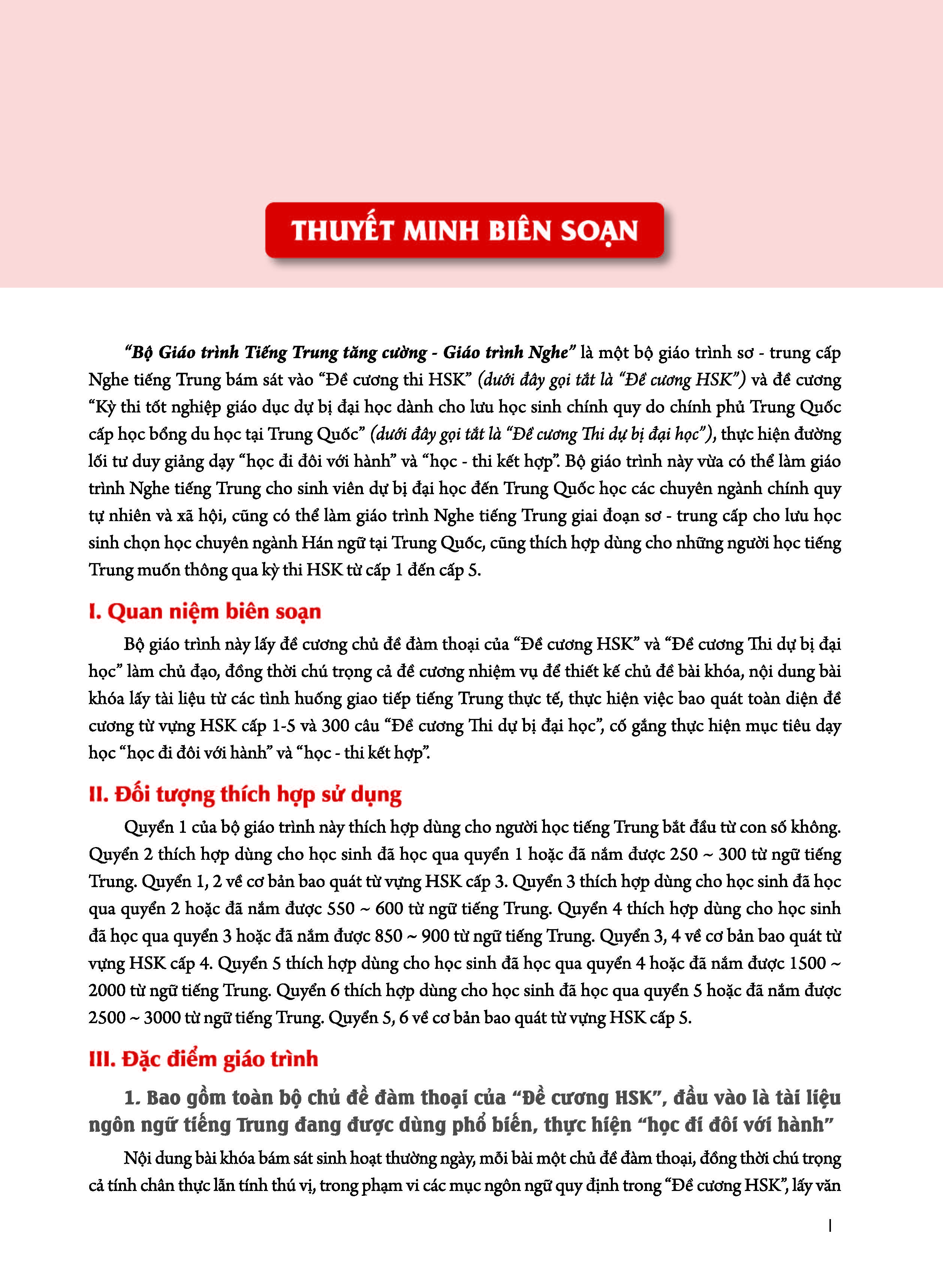 “Bộ Giáo trình Tiếng Trung tăng cường - Giáo trình Nghe” là một bộ giáo trình sơ - trung cấp Nghe tiếng Trung bám sát vào “Đề cương thi HSK” và đề cương “Kỳ thi tốt nghiệp giáo dục dự bị đại học dành cho lưu học sinh chính quy do chính phủ Trung Quốc cấp học bổng du học tại Trung Quốc”, thực hiện đường lối tư duy giảng dạy “học đi đôi với hành” và “học - thi kết hợp”. Bộ giáo trình này vừa có thể làm giáo trình Nghe tiếng Trung cho sinh viên dự bị đại học đến Trung Quốc học các chuyên ngành chính quy tự nhiên và xã hội, cũng có thể làm giáo trình Nghe tiếng Trung giai đoạn sơ - trung cấp cho lưu học sinh chọn học chuyên ngành Hán ngữ tại Trung Quốc, cũng thích hợp dùng cho những người học tiếng Trung muốn thông qua kỳ thi HSK từ cấp 1 đến cấp 5.
