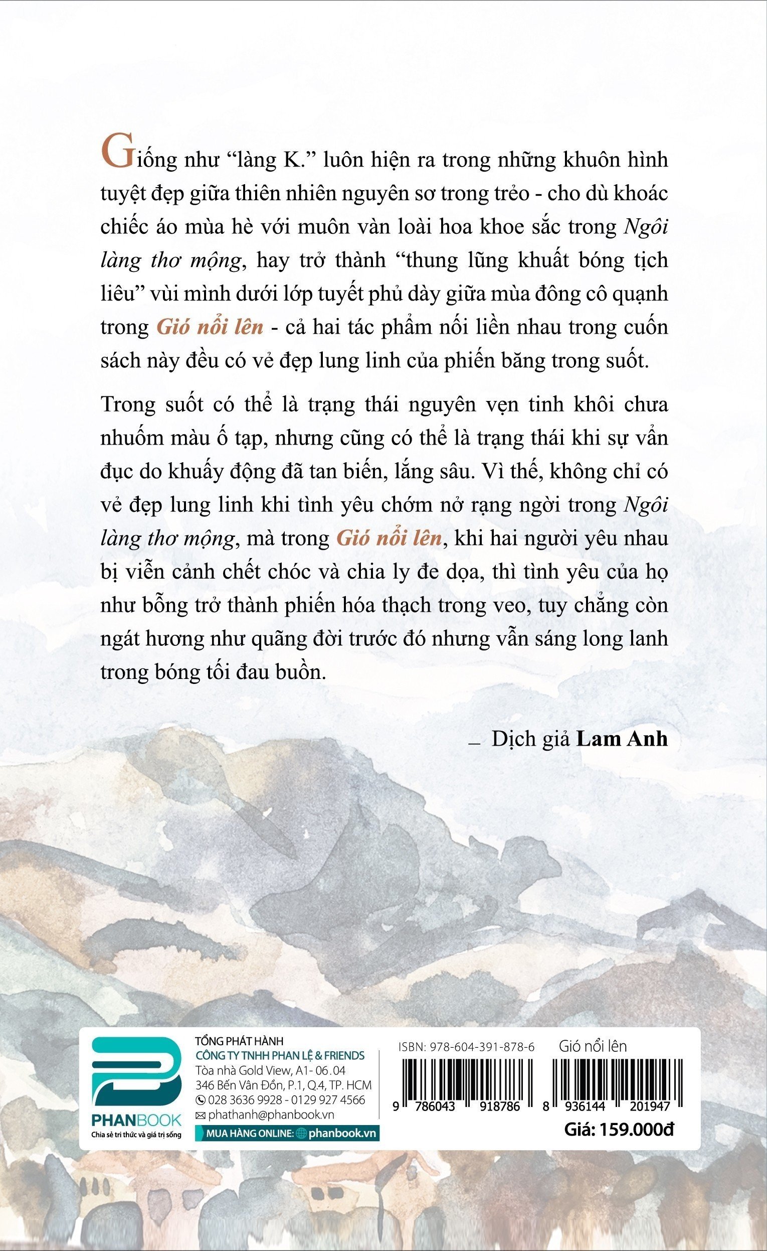 Giống như “làng K.” luôn hiện ra trong những khuôn hình tuyệt đẹp giữa thiên nhiên nguyên sơ trong trẻo - cho dù khoác chiếc áo mùa hè với muôn vàn loài hoa khoe sắc trong Ngôi làng thơ mộng, hay trở thành “thung lũng khuất bóng tịch liêu” vùi mình dưới lớp tuyết phủ dày giữa mùa đông cô quạnh trong Gió nổi lên - cả hai tác phẩm nối liền nhau trong cuốn sách này đều có vẻ đẹp lung linh của phiến băng trong suốt.
