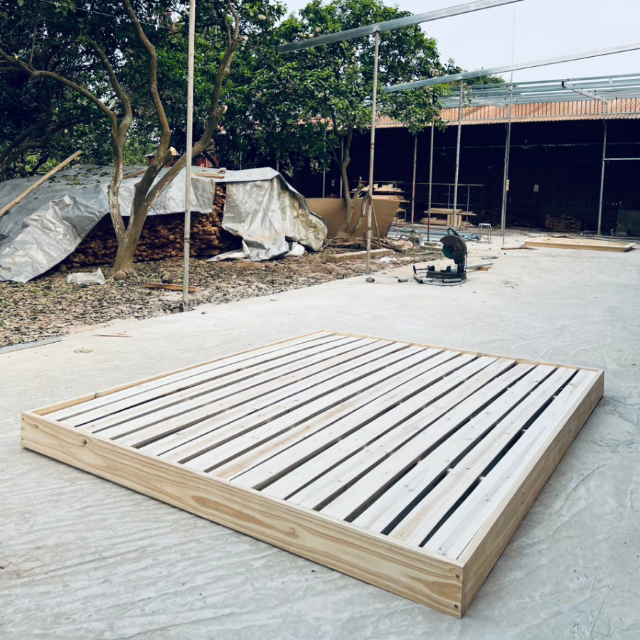 Bộ giường bao gồm: 2 thanh vai dọc, 2 thanh vai ngang, 2 thanh đỡ tựa, 3 thanh tựa ,4 chân giường và nan giường.