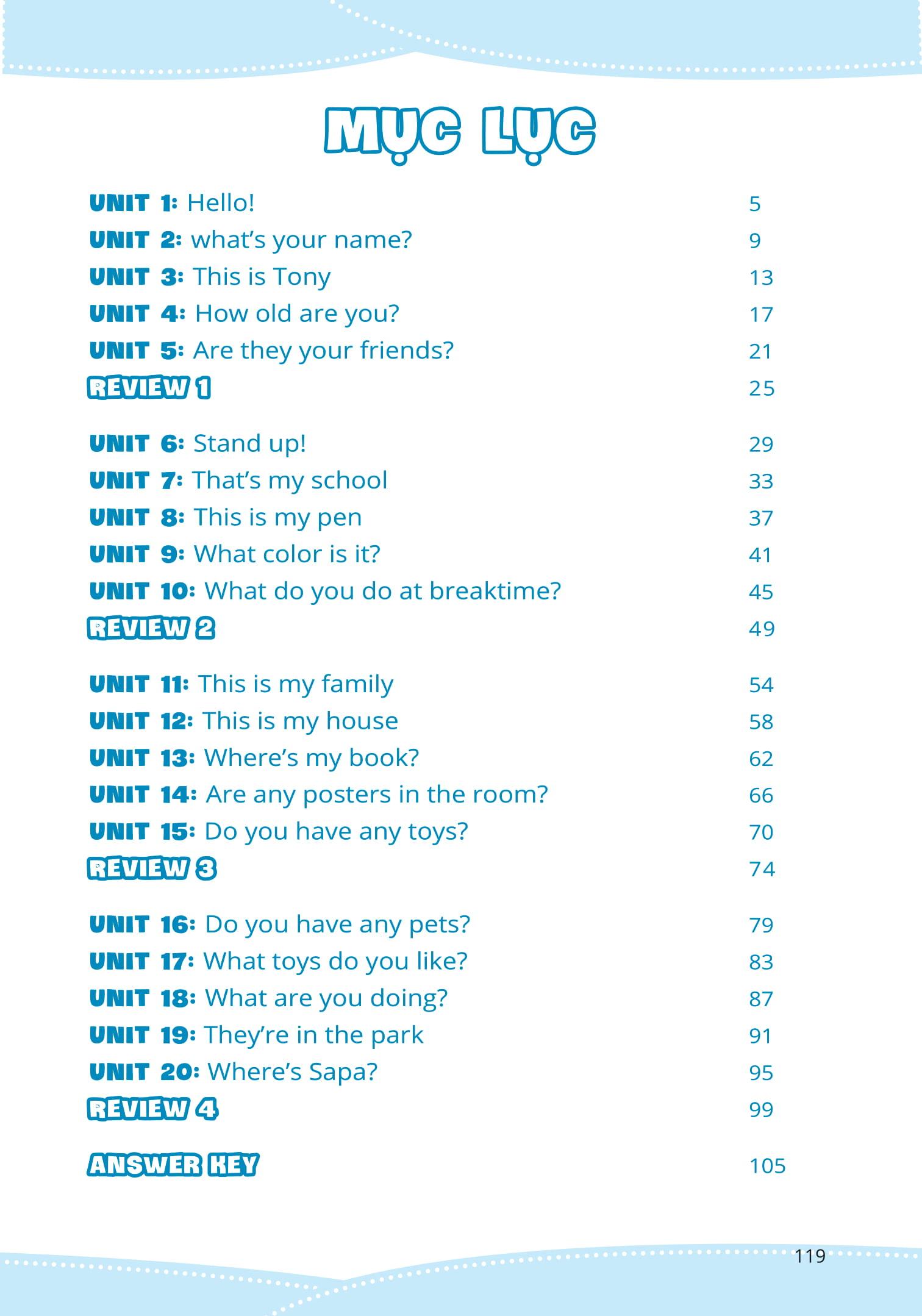 - Bài Review – Kiểm tra, đánh giá tổng hợp sau mỗi 5 Units Bài Review gồm các bài tập tổng hợp kiến thức của 5 Units vừa được học giúp các con kiểm tra, rà soát kiến thức hổng và thêm một lần học – nhớ kiến thức hiệu quả.