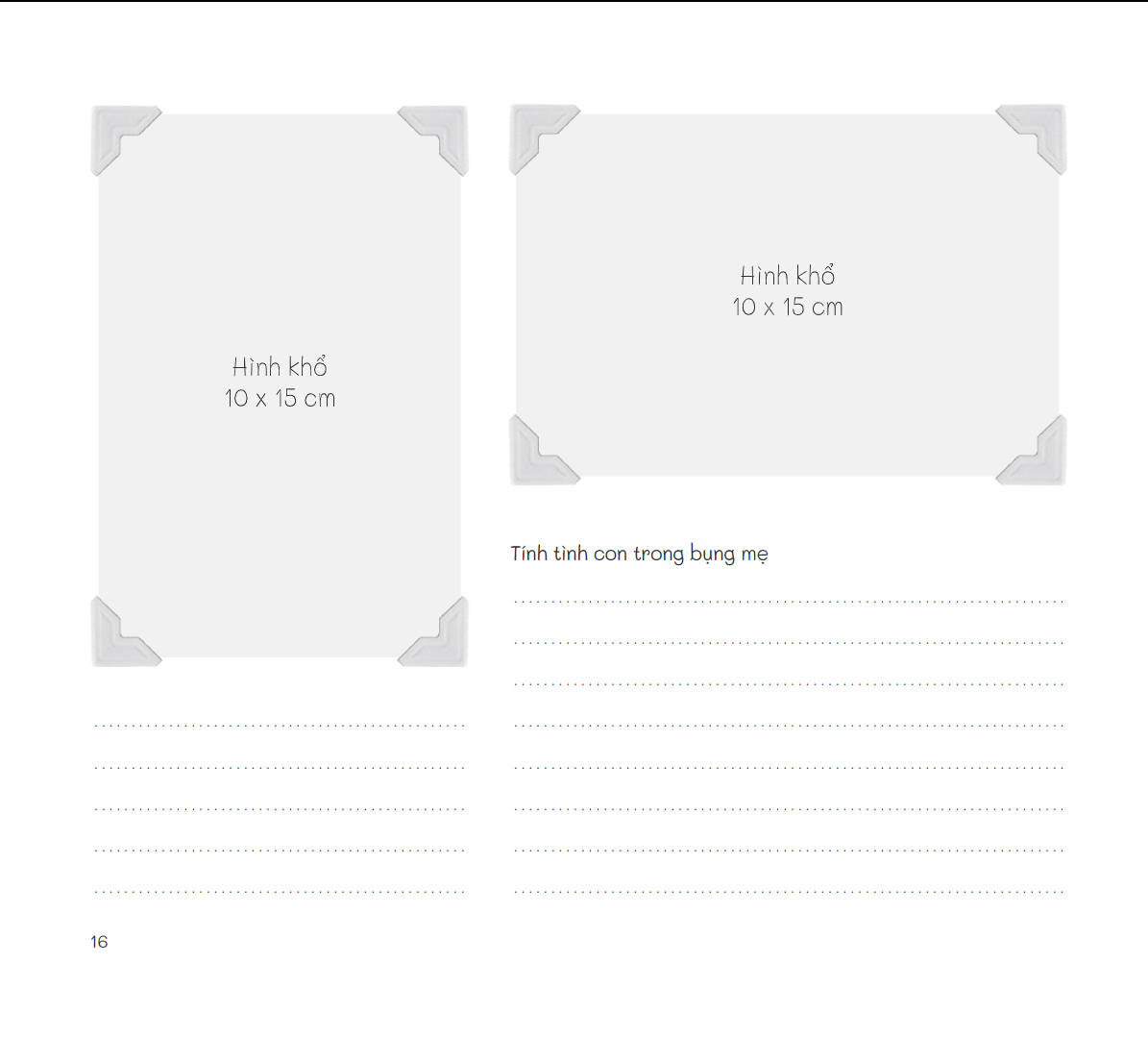 Một điều thú vị nữa, là tập sách này còn có những trang mở để mẹ ghi chép lại những cảm xúc của chính mẹ, trong hành trình yêu thương gắn liền với bé từ khi bé còn là cái mầm chút xíu trong bụng mẹ, cho đến khi bé tròn thôi nôi. Những khung ảnh trống cũng để dành cho mẹ cắt, dán hình ảnh của bé và các ‘nhân vật có liên quan’ đến bé. Sau này lớn lên, ngắm lại những dòng chữ này, những tấm ảnh này, sẽ nhớ và yêu lắm. Và những ký ức này sẽ trở nên quý giá hơn bao giờ hết và không tiền bạc nào mua nổi.