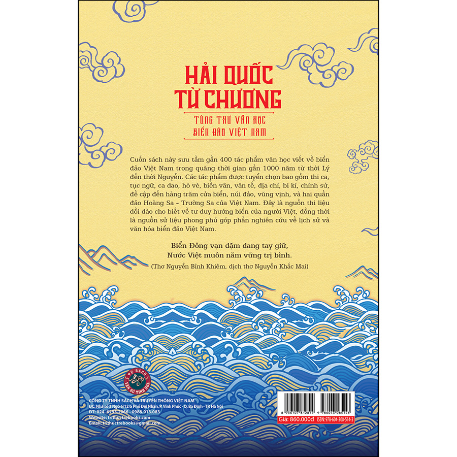 Cuốn sách quý vị đang cầm trên tay là cuốn sách giới thiệu những di sản văn chương viết về biển đảo Việt Nam trong suốt nghìn năm lịch sử. Tổng tập này sưu tầm, biên dịch, hiệu khảo, chú thích gần 350 tác phẩm văn học Hán Nôm thời trung - cận đại và gần 100 tác phẩm văn học dân gian (ca dao, tục ngữ, hò, vè) viết về lịch sử, phong tục, tập quán, sản vật địa phương, hải sản và những suy tư, tâm tình, những lời ăn tiếng nói mang hơi thở của biển cả.