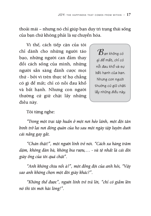 Hạnh phúc trong tập sách này không được định nghĩa, không có lý thuyết. Mỗi câu chuyện Osho kể với chúng ta đều giống như một thứ nước cất được tinh lọc từ một tâm hồn rất đỗi hiền minh, giàu yêu thương và trắc ẩn. Osho đã lên tiếng từ rất sâu trong tâm hồn chúng ta, rằng niềm vui sống sẽ hóa giải tất cả chứ không phải con người phải làm tất cả để có được niềm vui. Khước từ đau khổ cũng không phải là con đường của niềm vui sống. Chịu đựng nó và khóc than cho nó càng không giúp ta có được một tình yêu hài hòa với cuộc đời. Osho khuyến khích chúng ta chăm sóc nỗi đau khổ của bản thân, đối diện với nỗi đau ấy và vượt qua nó.
