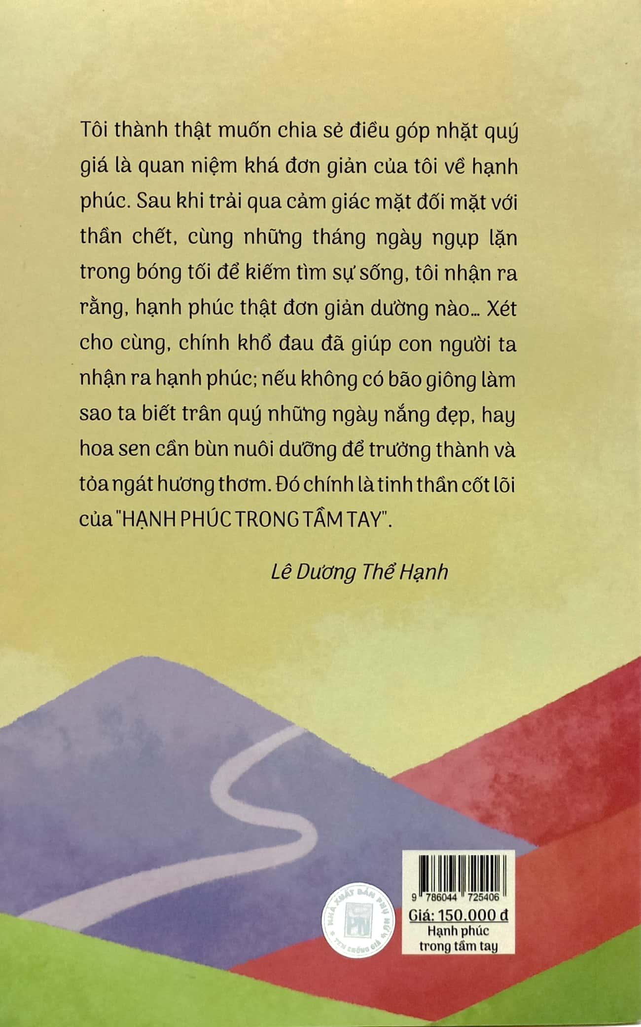 Hạnh Phúc Trong Tầm Tay - Lê Dương Thể Hạnh Hạnh phúc trong tầm tay của tác giả Lê Dương Thể Hạnh thuộc dòng sách bổ trợ kỹ năng sống, là "rút ruột" chia sẻ từ tác giả về những đức tính quý báu mà con người cần có trong đời để cuộc sống trở nên chất lượng, trọn vẹn hơn. Là một tác giả khuyết tật, viết sách bằng phần mềm hỗ trợ giọng nói và nhờ sự giúp đỡ của cộng sự, Lê Dương Thể Hạnh cho thấy một nghị lực phi thường trong việc gieo những con chữ thiện lương, được trau chuốt cẩn thận để giúp vun bồi tâm hồn những bạn đọc "thuận duyên" đọc sách. Đồng hành cùng bóng tối hơn 15 năm, hơn ai hết, tác giả thấu hiểu việc "vượt tối" để tìm đến ánh sáng lương thiện trong "cõi người ta" này vô cùng gian nan. Và với những người thuộc nhóm "còn lại" như chính bản thân tác giả - khuyết tật đủ thứ, khả năng di chuyển và hoạt động hạn chế - hành trình "vượt tối" còn gian nan hơn gấp nhiều lần. Tuy vậy, chị không bỏ cuộc. Ở độ tuổi mà mọi người đã yên bề gia thất, con cái lớn khôn, tác giả Lê Dương Thể Hạnh, như bộc bạch của chị trong các trang sách, vẫn vui vẻ bên gia đình, cha mẹ, vẫn tận hưởng cuộc sống theo cách của riêng m.ình, và để biết rằng, ngày nào còn thở trên cuộc đời này thôi đã là may mắn lắm rồi. Nhưng những điều mà chị muốn độc giả hướng đến không dừng lại ở đó. Chị tâm sự: "Đến với Hạnh phúc trong tầm tay, có lẽ bạn sẽ tạm quên đi những nỗi đau ở quá khứ, và bạn cũng xa rời gánh nặng áo cơm để trở về với những giá trị - rất bình dị và rất chân thật từ trong sâu thẳm tâm hồn m.ình". Các chủ đề mà tác giả Lê Dương Thể Hạnh xoáy sâu vào gồm có bình yên, bao dung, khiêm tốn, yêu thương, lễ - nghĩa - trí - tín, tương trợ, tự do và hạnh phúc. Tuy xa mà gần, tuy gần mà xa, chị dẫn dắt độc giả qua từng chủ đề một cách dí dỏm, lối dẫn chuyện có duyên, văn phong khúc chiết để thấy được rằng, hạnh phúc không ở đâu xa mà nằm trong lòng bàn tay ta! Chị bộc bạch: "… Khi may mắn được sinh ra với cơ thể và trí não của một con người, có lẽ ta nên kích hoạt sóng não dành cho con người, vượt qua những nỗi sợ, mạnh dạn tiến về phía trước để đón nhận một tương lai tốt đẹp và thanh thản lưu lại những điều kỳ diệu cho cuộc đời. Và đây chính là tinh thần cốt lõi của Hạnh Phúc Trong Tầm Tay.