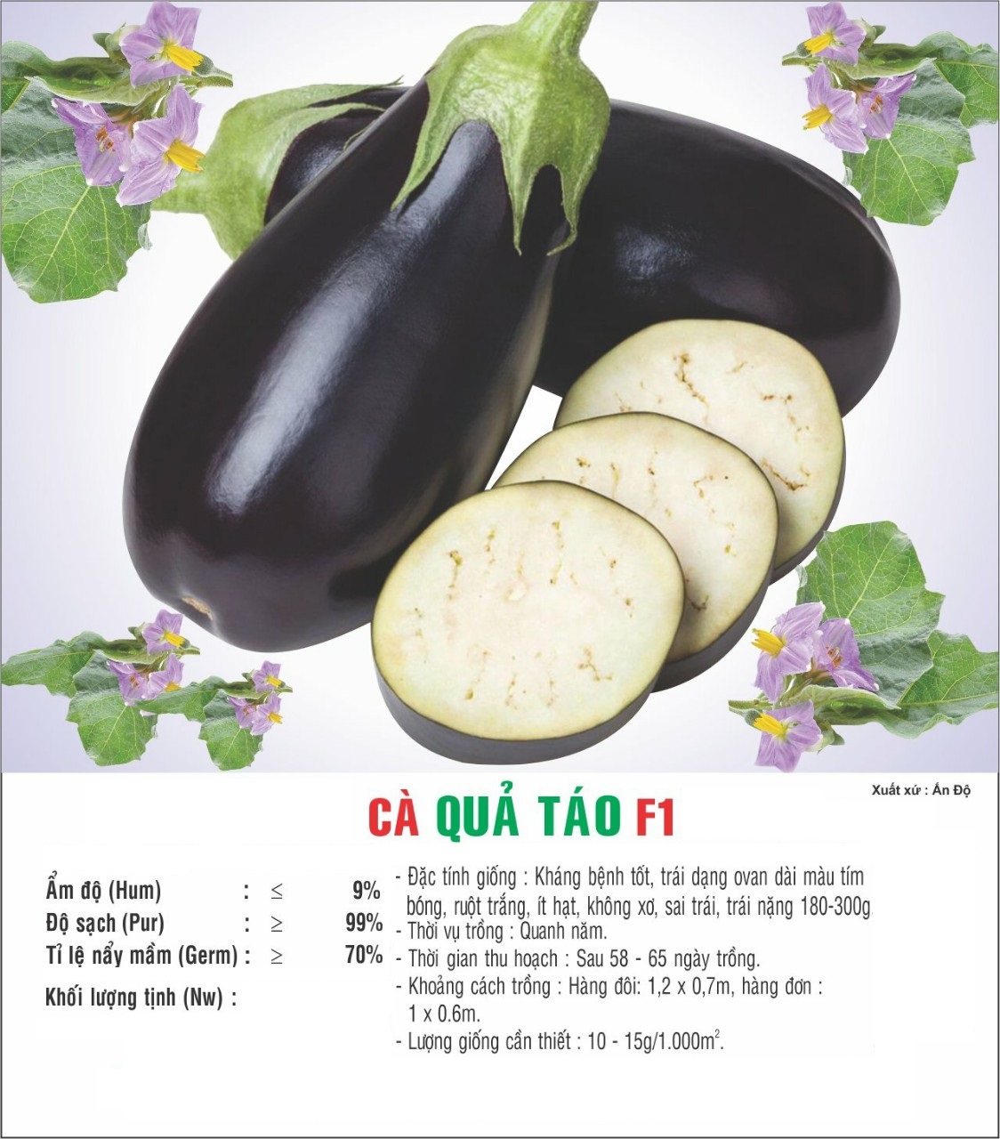 - Đặc tính giống: Cà tím quả táo - giống sinh trưởng, phát triển khỏe và kháng bệnh tốt. Trái dài oval màu tím nhạt bóng, ruột trắng, ít hạt, không xơ, trái nặng 180-300g