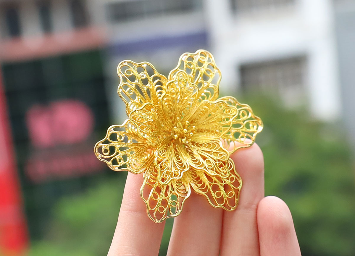 Sản phẩm ve cài áo mạ vàng của Golden Gift Việt Nam được chế tác thủ công bởi bàn tay người thợ tài hoa với những đường nét tinh xảo tạo nên từ các chất liệu quý hiếm. Trải qua hơn 20 công đoạn chế tác khác nhau bông hoa cài áo mang vẻ đẹp tinh tế được khoác lên mình sắc vàng lấp lánh của lớp vàng.
