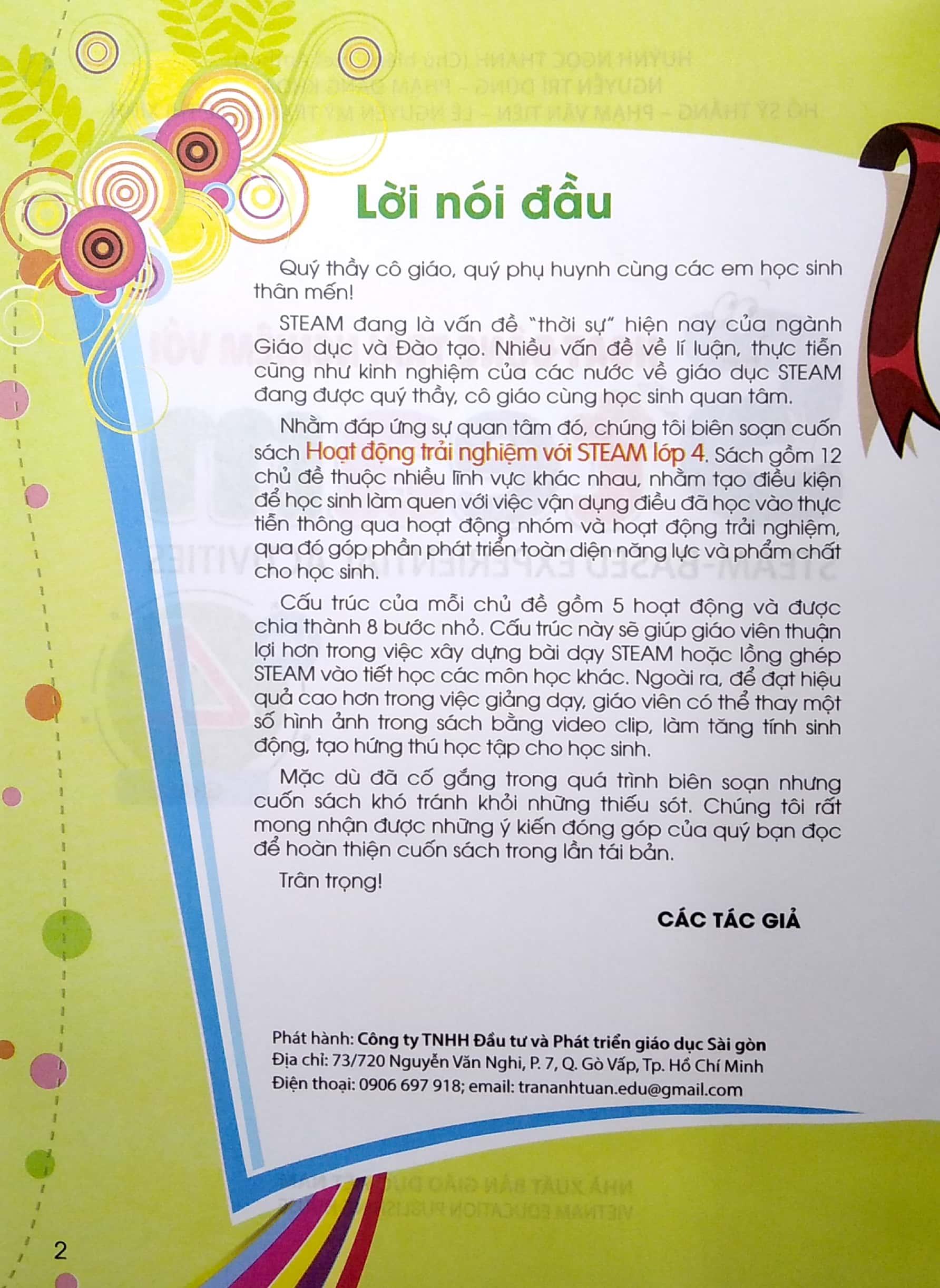 Nhằm đáp ứng sự quan tâm đó, chúng tôi biên soạn cuốn Sách Hoạt động trải nghiệm với STEAM lớp 4. Sách gồm 12 chủ đề thuộc nhiều lĩnh vực khác nhau, nhằm tạo điều kiện để học sinh làm quen với việc vận dụng điều đã học vào thực tiễn thông qua hoạt động nhóm và hoạt động trải nghiệm, qua đó góp phần phát triển toàn diện năng lực và phẩm chất cho học sinh,