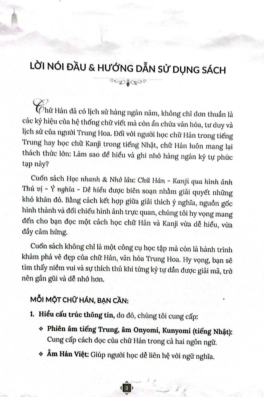 Cuốn sách Học nhanh & Nhớ lâu: Chữ Hán - Kanji qua hình ảnh Thú vị - Ý nghĩa - Dễ hiểu được biên soạn nhằm giải quyết những khó khăn đó. Bằng cách kết hợp giữa giải thích ý nghĩa, nguồn gốc hình thành và đối chiếu hình ảnh trực quan, chúng tôi hy vọng mang đến cho bạn đọc một cách học chữ Hán và Kanji vừa dễ hiểu, vừa đẩy cảm hứng.