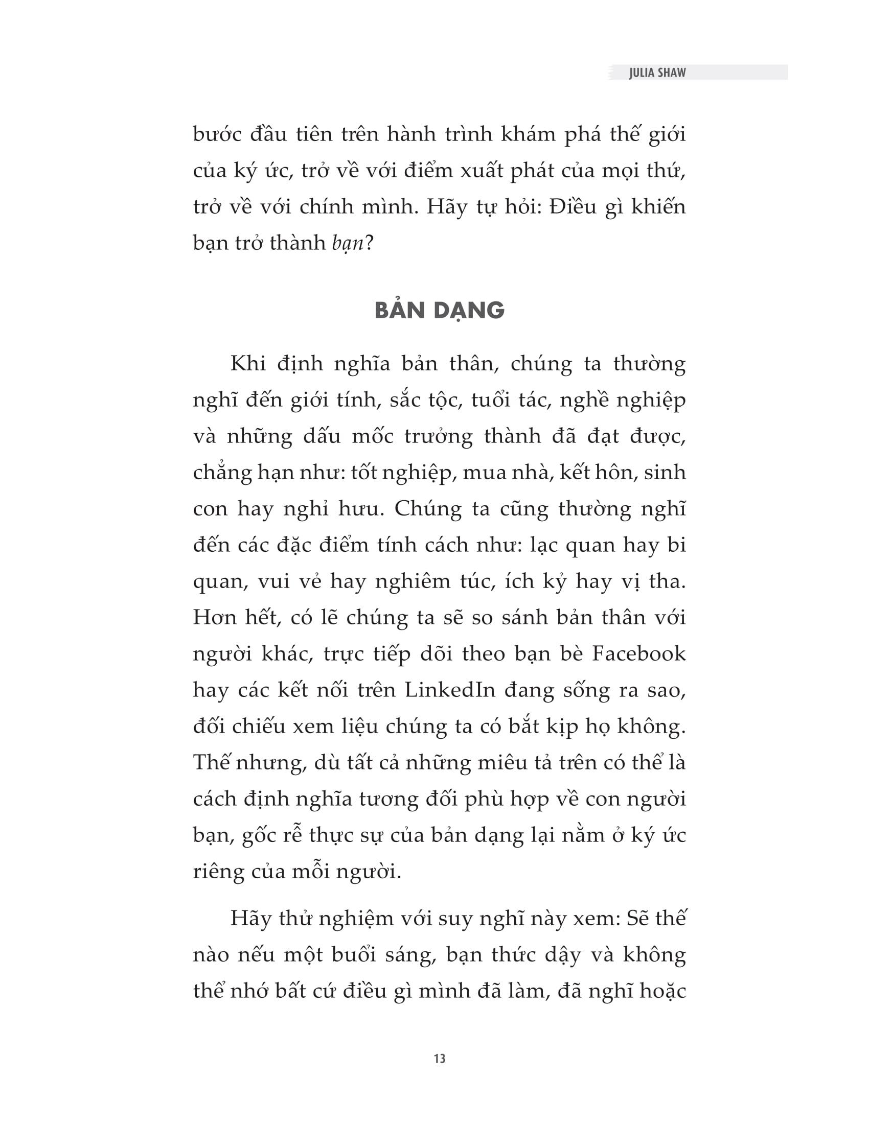 - Bạn nghĩ rằng mọi ký ức của m.ình đều hoàn toàn chính xác? Những lỗi trong quá trình ghi nhớ của chúng ta diễn ra rất phổ biến. Mọi người thường nghĩ rằng bộ não của chúng ta ghi nhớ như một thứ giống như một máy ghi hình - ghi lại và lưu trữ mọi thứ xảy ra với độ chính xác tuyệt đối . Trong thực tế, rất dễ mắc các lỗi trong việc ghi nhớ. Nhiều người có thể vô cùng tự tin rằng trí nhớ của họ chính xác, nhưng thực tế đáng buồn là, trí nhớ không phải bản ghi chép quá khứ chính xác và hoàn hảo như chúng ta vẫn tưởng. Ký ức liên tục biến mất. Ta bước vào phòng và ngay lập tức quên mất m.ình vào đây để làm gì, hoặc ta đột nhiên không thể nhớ ra tên của một người mà m.ình đã gặp nhiều lần trước đó. Vậy hãy thử tưởng tượng, những hậu quả nghiêm trọng nào có thể bị kéo theo, nếu như bộ nhớ đầy thiếu sót của ta không những quên, mà còn có nguy cơ bóp méo thông tin và thêu dệt nên một ký ức hoàn toàn mới - ngay cả khi chuyện đó chưa từng xảy ra? Hội chứng ký ức giả là cuốn sách tổng hợp những nghiên cứu mới nhất về não bộ và trí nhớ: cơ chế ghi nhớ của não bộ, các yếu tố hình thành nên những ký ức không có thật và một số nguyên tắc để cải thiện trí nhớ. Trong cuốn Hội chứng ký ức giả, nhà tâm lý học pháp y, đồng thời là chuyên gia về trí nhớ, Tiến sĩ Julia Shaw đ.ã sử dụng những nghiên cứu mới nhất cho thấy cách bộ não của chúng ta bóp méo ký ức đúng đắn và tạo ra những ký ức về sự kiện không có thực. Cuốn sách đưa ra các dẫn chứng cho người đọc hiểu rằng, ký ức giả không chỉ ảnh hưởng tới chính bản thân người sở hữu ký ức đó, mà còn ảnh hưởng tới xã hội như thế nào: Ký ức giả có thể khiến chúng ta tự tin thái quá vào khả năng ghi nhớ của chính m.ình, khiến cảnh sát bỏ tù không ít người vô tội, thậm chí có thể khiến một người nổi tiếng tiêu tan sự nghiệ Không chỉ có vậy, cuốn sách còn tiết lộ cách để cải thiện trí nhớ thông qua việc thừa nhận ký ức có nguy cơ bị sai sót. Từ đó, người đọc không chỉ sở hữu những kiến thức về khoa học trí nhớ, mà còn biết thêm nhiều phương pháp giúp tăng cường khả năng lưu giữ thông tin chính xác và hiệu quả. Lôi cuốn và đầy bất ngờ, Hội chứng ký ức giả chính là một người bạn đồng hành trên con đường khám phá bản thân chúng ta dựa trên cơ sở khoa học về trí nhớ. Cuốn sách này sẽ giúp chúng ta hiểu hơn về cách ghi nhớ của não bộ, về tính đúng đắn của những ký ức mà ta sở hữu, khiến bạn phải đặt câu hỏi rằng bạn thực sự hiểu bản thân m.ình đến mức nào. Về tác giả Tiến sĩ Julia Shaw là một giảng viên và nhà nghiên cứu kỳ cựu của Trường Luật và Khoa học Xã hội, Đại học London South Bank, đồng thời là một trong số ít chuyên gia trên thế giới thực hiện nghiên cứu về những sai sót trí nhớ phức tạp liên quan đến các sự kiện cảm xúc cá nhân - hay còn gọi là những “ký ức sống động nhưng hoàn toàn không có thật”. Tiến sĩ Shaw xuất bản nhiều bài viết khoa học trên các tạp chí học thuật quốc tế, xây dựng giáo trình, thường xuyên cộng tác với tạp chí khoa học nổi tiếng Scientific American, thỉnh giảng và tham gia thuyết trình tại các hội thảo trên khắp thế giới. Cô cũng giảng dạy các lớp ở bậc đại học và sau đại học, đồng thời đã thắng hai giải thưởng dạy học xuất sắc.