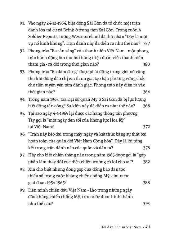Sách gồm những câu hỏi đáp lịch sử ở thời kỳ kháng chiến chống Mỹ cứu nước (1954-1965). Những thông tin được trình bày trong sách đảm bảo tính chính xác khoa học nhưng cũng rất súc tích, ngắn gọn, dễ đọc, dễ hiểu. Bên cạnh đó là phần mục lục câu hỏi giúp bạn tiện tra cứu.