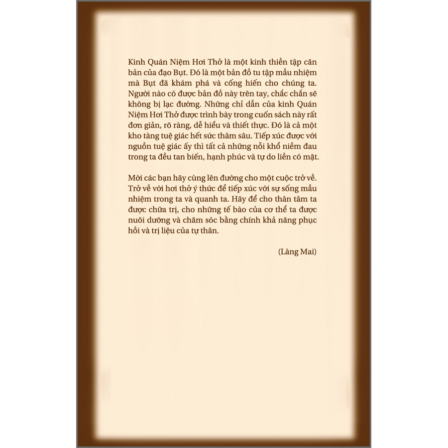 Kinh Quán Niệm Hơi Thở là một kinh thiền tập căn bản của đạo Bụt. Đó là một bản đồ tu tập mầu nhiệm mà Bụt đã khám phá và cống hiến cho chúng ta. Người nào có được bản đồ này trên tay, chắc chắn sẽ không bị lạc đường. Những chỉ dẫn của kinh Quán Niệm Hơi Thở được trình bày trong cuốn sách này rất đơn giản, rõ ràng, dễ hiểu và thiết thực. Đó là cả một kho tàng tuệ giác hết sức thâm sâu. Tiếp xúc được với nguồn tuệ giác ấy thì tất cả những nỗi khổ niềm đau trong ta đều tan biến, hạnh phúc và tự do liền có mặt.