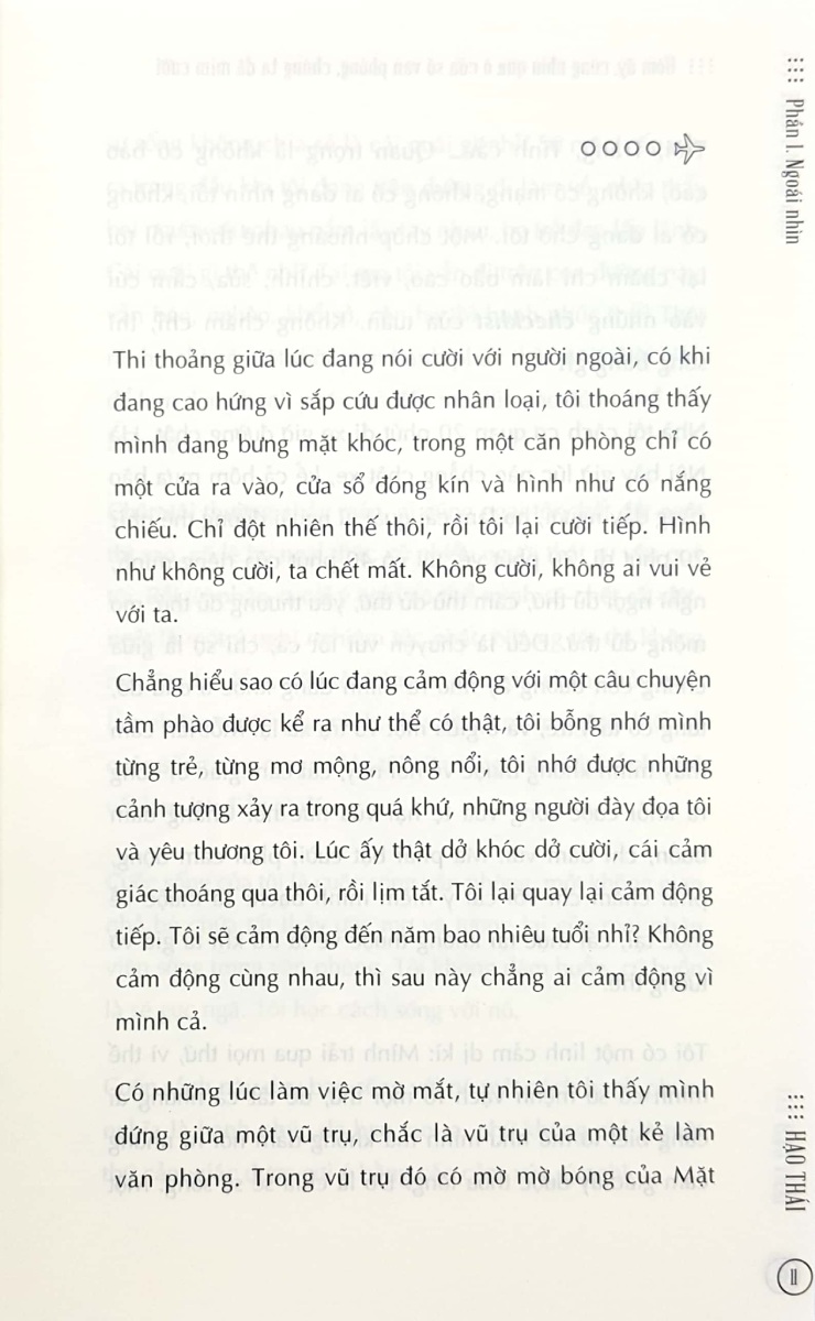 Hôm Ấy Cùng Nhìn Qua Ô Cửa Sổ Văn Phòng Chúng Ta Đã Mỉm Cười Mỗi lần chập chờn nghĩ về những ước mơ tuổi trẻ, tôi dường như có thể bay lên một bầu trời, ngồi giữa mây gió, nhìn lại quá khứ thanh sạch và luẩn quẩn. Tôi ngồi trên cái bàn toe toét chữ ngó ra cánh cửa của thời trung học, ngoài đó là sân trường nhỏ bé mà hồi đó cứ mênh mông, có mùi thoang thoảng của gió lẫn với mùi tường gạch và mồ hôi. Ngoài đó có cả một tuổi đời tôi chưa hề phải bon chen, có cả một thế giới tôi cứ vật lộn nhỏ bé mà tưởng là đã đi hết sự sống trần gian. Thế mà, trong văn phòng làm việc, tôi đã đánh mất tên và tuổi trẻ. Chỉ còn lại một ý niệm vô danh dang dở, những con đường tắc chật người xa lạ và những nuối tiếc vụng về. Tôi không dám buồn, cứ buồn là sẽ gục ngã. Tôi học cách sống với nó… Trên bầu trời của mình, tôi tìm thấy chính mình, không phải vì mình đã trưởng thành hay còn trẻ dại, mà chỉ đơn giản là được sống với tất cả những gì mình tin tưởng bằng lý trí và lòng nhiệt thành. Bạn thân mến, chưa bao giờ là muộn để sống cho tuổi trẻ bằng trái tim nhiệt huyết và lí trí tỉnh táo. Hãy nắm lấy tay tôi, bước vào một văn phòng khác, nơi mà… HÔM ẤY, CÙNG NHÌN QUA Ô CỬA SỔ VĂN PHÒNG CHÚNG TA ĐÃ MỈM CƯỜI.