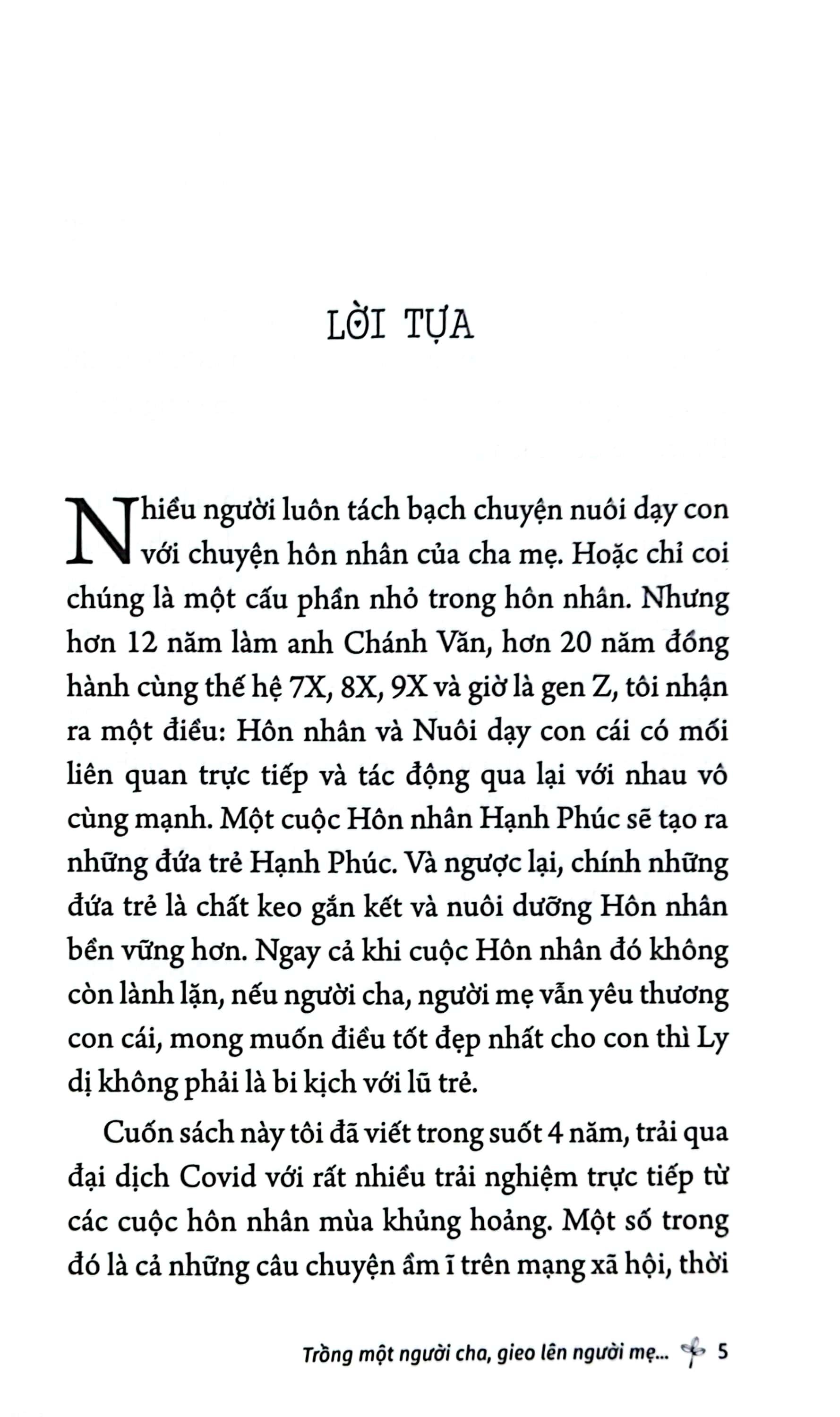 Cuốn sách là một liệu pháp tinh thần để giúp người phụ nữ nào cũng là Mẹ Hạnh Phúc, đàn ông nào cũng là Bố Hạnh Phúc, trẻ con nào cũng là Con Hạnh Phúc, Hôn nhân nào cũng là Hôn nhân Hạnh Phúc, kể cả Ly dị, làm mẹ đơn thân, cha đơn thân thì Ly dị cũng phải Hạnh Phúc, mẹ đơn thân cũng Hạnh Phúc, cha đơn thân cũng Hạnh Phúc.