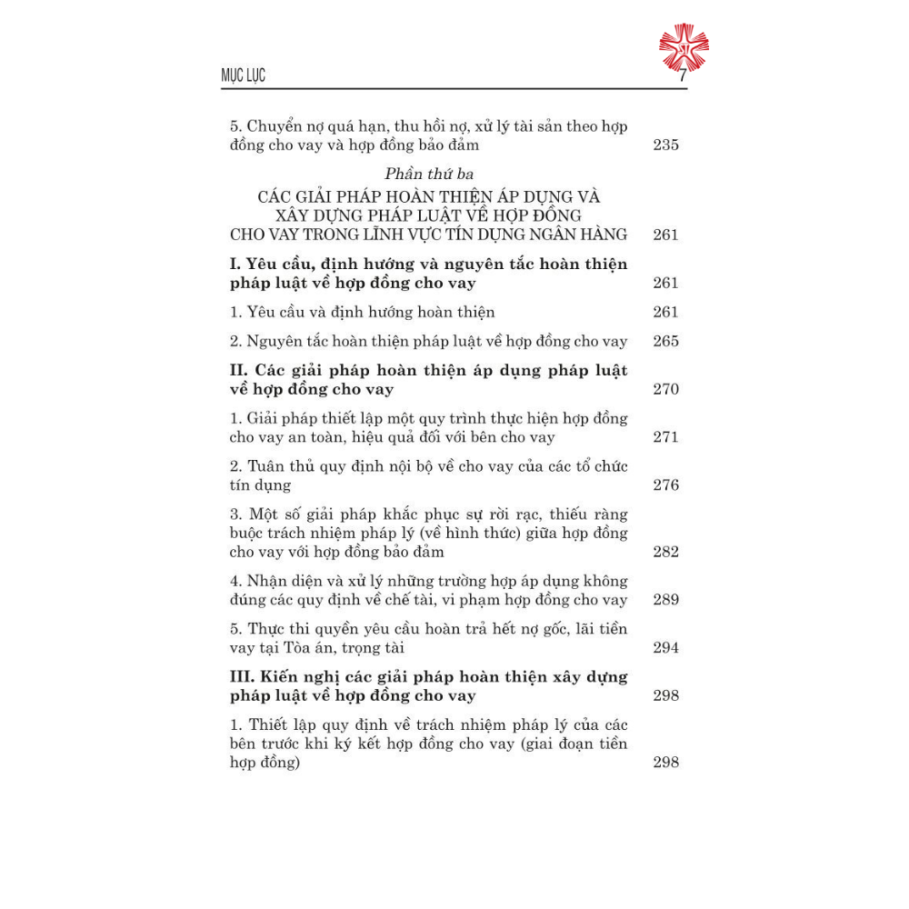Cuốn sách phân tích những vấn đề khung lý thuyết, pháp luật và thực trạng pháp luật Việt Nam về hợp đồng cho vay trong lĩnh vực tín dụng ngân hàng. Ngoài ra, tác giả có đề xuất các giải pháp hoàn thiện pháp luật, đưa ra một số kiến nghị góp phần hoàn thiện pháp luật về hợp đồng cho vay trong lĩnh vực này, bảo đảm sự phát triển an toàn, lành mạnh của hệ thống các tổ chức tín dụng; bảo vệ quyền lợi ích hợp pháp, duy trì và nâng cao lòng tin của khách hàng vay; bảo đảm việc chấp hành chính sách pháp luật góp phần nâng cao hiệu quả và hiệu lực quản lý nhà nước trong lĩnh vực tín dụng ngân hàng.