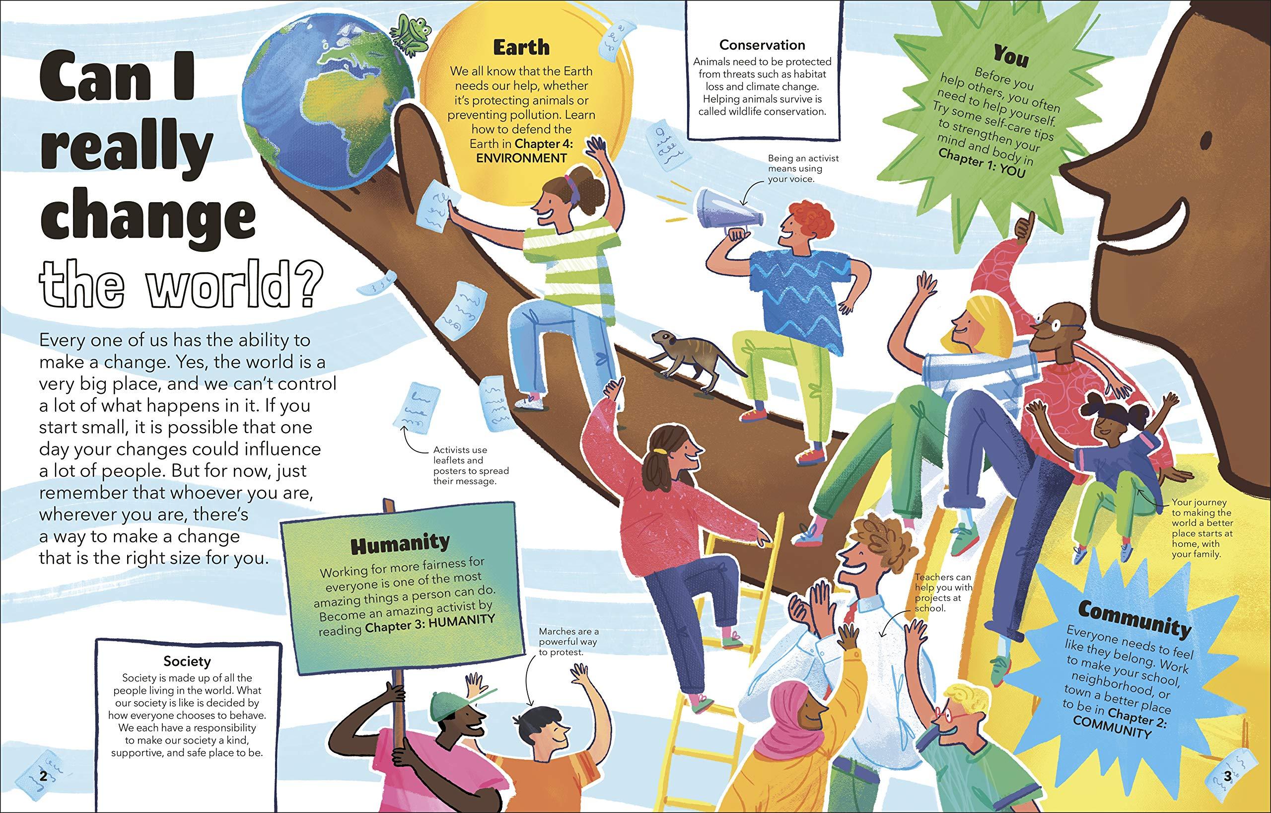 Through ideas as small as creating a neighborhood lending library to as important as public speaking and how to talk about politics, How to Make a Better World is a practical guide to activism for children.Well-written and divided into sections on You, Community, Environment, and more, this educational book helps children to look at what they might like to achieve, and the logical approach makes it easy to navigate if you want to tie topics up with school projects. Brightly illustrated inclusive art makes this factbook as visually appealing as its message. You can easily jump around without any loss of comprehension and dip in for short or longer periods. Learn about tricky social interactions like friendship fallouts, or bullying and how to maneuver them, or find out how to go about creating activist campaigns to tackle climate change or social injustice.If kids are to think positive thoughts and be part of movements for positive change, they need to be encouraged to do it. This book is full of wonderful facts about the world, presenting such positivity as cool, sensible, exciting, and achievable. The perfect starter book to activism for kids.Make A Change - Change The World!If you want to create a better world that is equally awesome for everyone, this book is for you