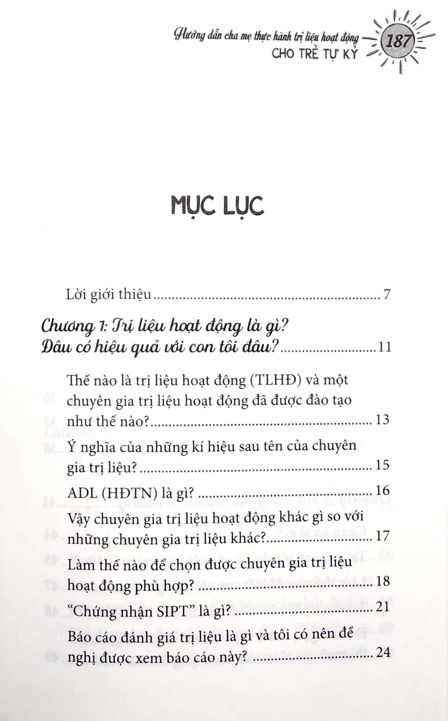 Với chủ đề đa dạng, từ tiến trình xử lí cảm giác đến kĩ năng viết, kĩ năng đi vệ sinh… cuốn sách này thực sự là một cuốn cẩm nang bỏ túi dành cho các bậc phụ huynh. Mỗi phần đều là những câu hỏi mà tác giả – một nhà trị liệu nhi khoa - được hỏi nhiều nhất. Cuối mỗi câu hỏi là phần “Hoạt động thực tế” mà các bậc phụ huynh có thể làm cùng con để cùng đạt đích. Có rất nhiều hoạt động và cũng rất dễ áp dụng ở tại nhà.