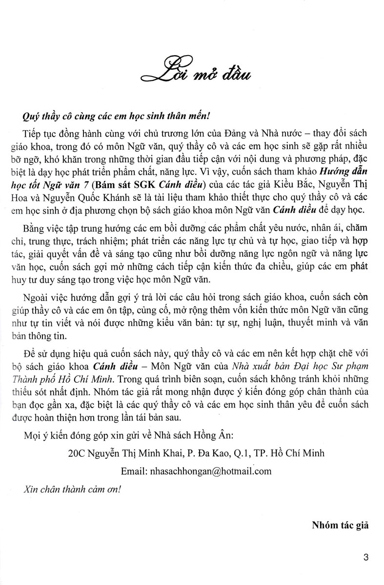 Tiếp tục đồng hành cùng với chủ trương lớn của Đảng và Nhà nước – thay đổi sách giáo khoa, trong đó có môn Ngữ văn, quý thầy cô và các em học sinh sẽ gặp rất nhiều bỡ ngỡ, khó khăn trong những thời gian đầu tiếp cận với nội dung và phương pháp, đặc biệt là dạy học phát triển phẩm chất, năng lực. Vì vậy, cuốn sách tham khảo Hướng Dẫn Học Tốt Ngữ Văn 7 (Bám Sát SGK Cánh Diều) của các tác giả Kiều Bắc, Nguyễn Thị Hoa và Nguyễn Quốc Khánh sẽ là tài liệu tham khảo thiết thực cho quý thầy cô và các em học sinh ở địa phương chọn bộ sách giáo khoa môn Ngữ văn Cánh diều để dạy học.