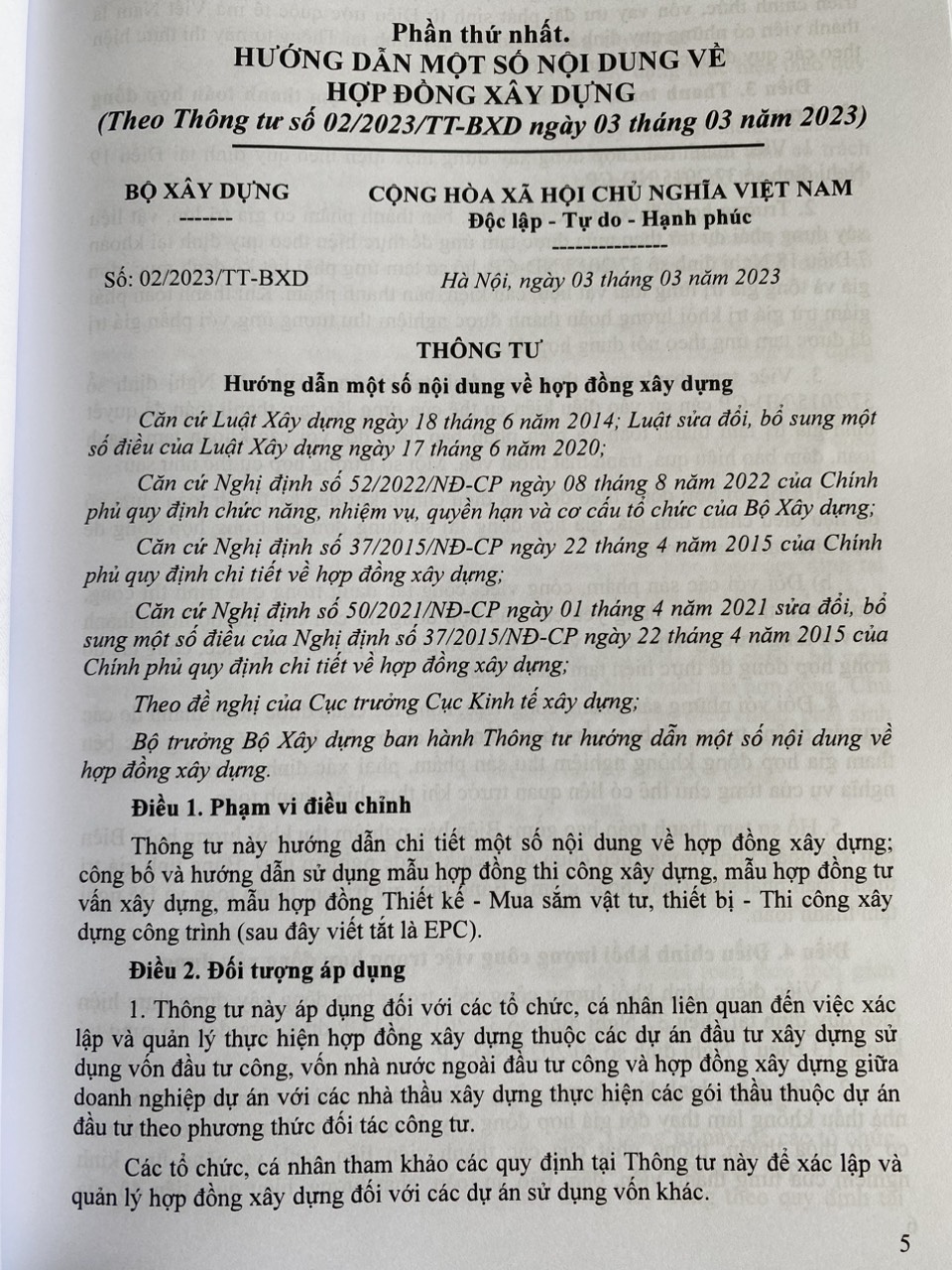 Phần thứ nhất. Hướng dẫn một số nội dung về hợp đồng xây dựng (theo thông tư số 02/2023/TT-BXD ngày 03 tháng 03 năm 2023)