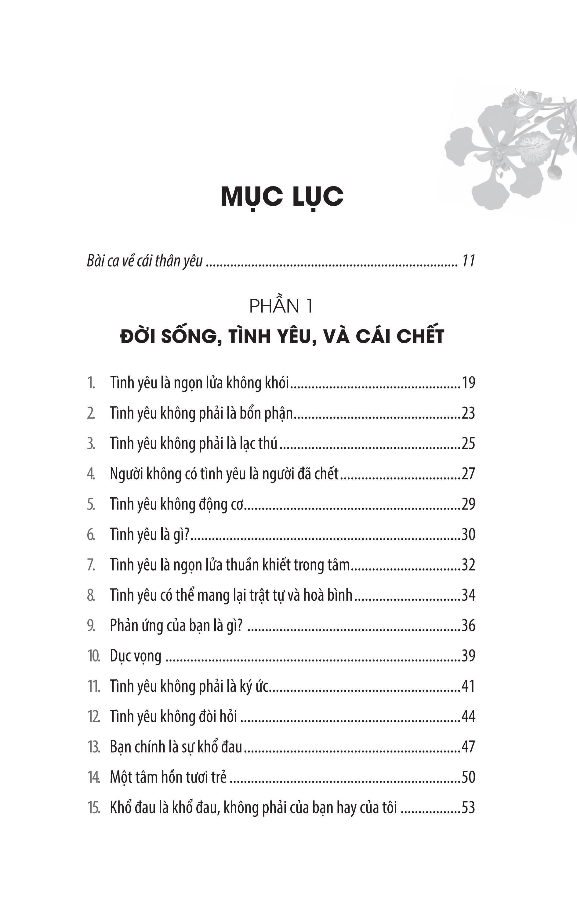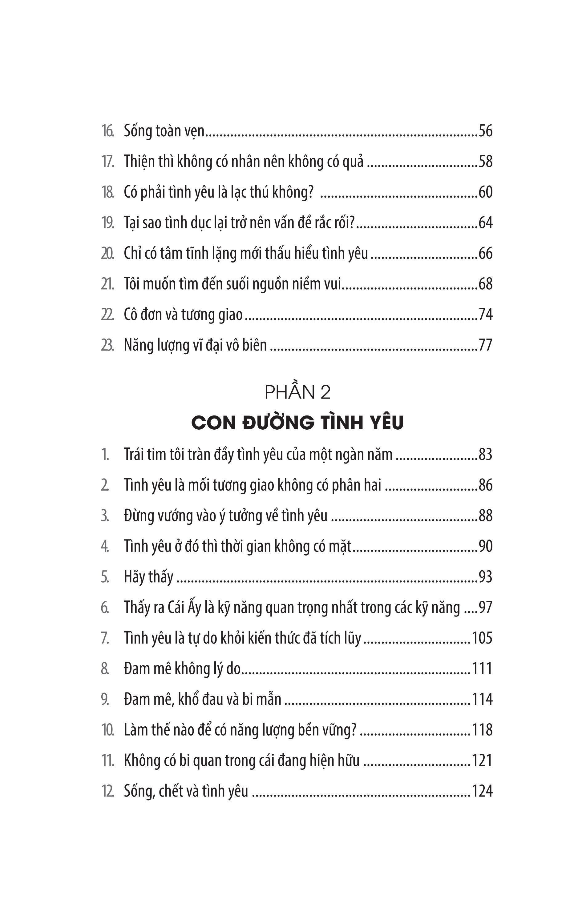 Cuốn sách được viết với ba phần chính: Phần 1 là “Đời sống, tình yêu và cái chết”, phần 2 là “Con đường tình yêu” và phần 3 là “Tình yêu là thực tại”, sẽ dẫn dắt người đọc vào các cung bậc và khía cạnh của tình yêu.
