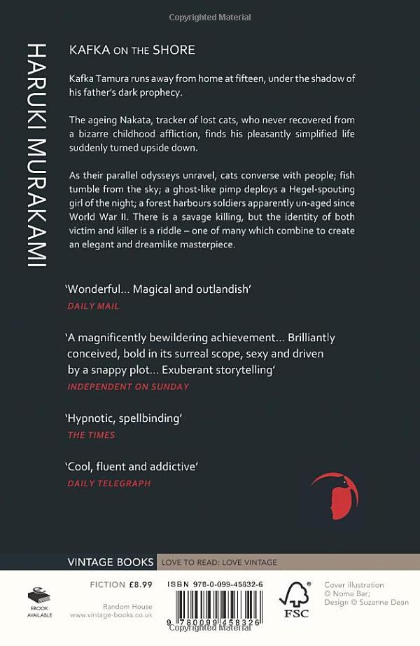 Kafka Tamura runs away from home at fifteen, under the shadow of his father's dark prophesy. The aging Nakata, tracker of lost cats, who never recovered from a bizarre childhood affliction, finds his pleasantly simplified life suddenly turned upside down. As their parallel odysseys unravel, cats converse with people; fish tumble from the sky; a ghost-like pimp deploys a Hegel-spouting girl of the night; a forest harbours soldiers apparently un-aged since World War II.