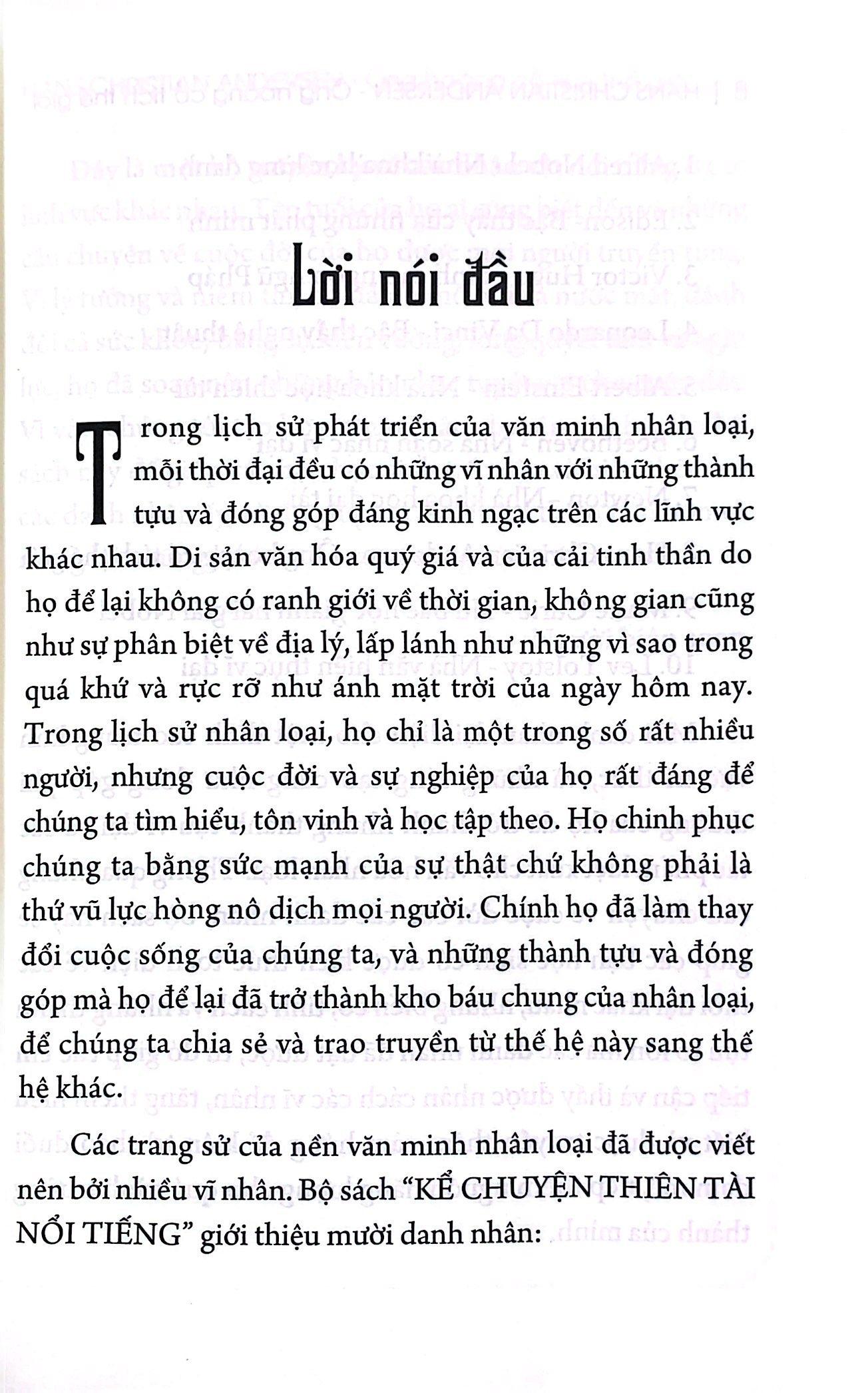 Bộ sách “KỂ CHUYỆN THIÊN TÀI NỔI TIẾNG” giới thiệu các danh nhân như: Alfred Nobel, Edison, Victor Hugo, Leonardo Da Vinci, Albert Einstein, Beethoven, Newton, Hans Christian Andersen, Marie Curie, Lev Tolstoy…