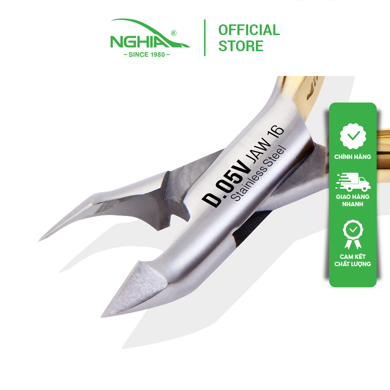 - Kỹ thuật chế tạo mang kềm đan xen bền chắc giúp độ bén bền lâu. Đặc điểm nổi bật Chất liệu Thép không gỉ (Inox), an toàn cho người dùng. Màu sắc Vàng. Kiểu chống 1 chống. Kiểu mang 3 mang tròn. Kích thước (DxRxC mm) Mũi 14 (6.0 +/- 0.5mm)/ Mũi 16 (7.0 +/- 0.5mm). 106(+/-0.8)x48(+/-0.8)x9.5(+/-0.5) Trọng lượng 67 gr. Thiết kế Thiết kế kiểu dáng phù hợp với bàn tay người Châu Á. Lưỡi kềm sắc mỏng, tinh xảo, độ chính xác cao nên cắt chính xác gọn gàng không làm tổn thương da khi cắt. Lưỡi kềm bén ngọt, độ bền cao, không cần mài lại khi mua. Kềm cắt da D.05V được mạ vàng và áp dụng công nghệ xi mạ an toàn cho da tay. Sản phẩm được sản xuất theo chuẩn ISO 9001 - 2015. Thương hiệu Kềm Nghĩa Được người tiêu dùng và thợ chuyên nghiệp ưu tiên lựa chọn hơn 20 năm, đạt nhiều giải thưởng như: Hàng Việt Nam chất lượng cao, Thương hiệu quốc gia. Loại bao bì Hộp nhựa vuông. Mô tả: Sản phẩm Kềm cắt da D.05V của Kềm Nghĩa được xem là một trong những sự lựa chọn hàng đầu của khách hàng chuyên nghiệp. Đây là một trong những sản phẩm bán chạy nhất của Kềm Nghĩa hiện nay. Sản phẩm được chế tác từ chất liệu cao cấp, an toàn cho người sử dụng. Mũi và lưỡi kềm được thiết kế phù hợp để dễ đi vào phần da và làm sạch phía trong móng. Kỹ thuật chế tạo mang kềm đan xen bền chắc giúp độ bén bền lâu. Chống kềm và rãnh giúp tự động bung cán kềm ra khi cắt mà không cần các ngón tay đẩy giúp người dùng dễ dàng tự cắt da tại nhà. Bao bì hộp nhựa sang trọng giúp bảo quản tốt sản phẩm và phù hợp làm quà tặng Lưu ý sử dụng: Sản phẩm chỉ dùng để cắt da tay, da chân, không dùng để cắt các vật cứng. Cách bảo quản sản phẩm :