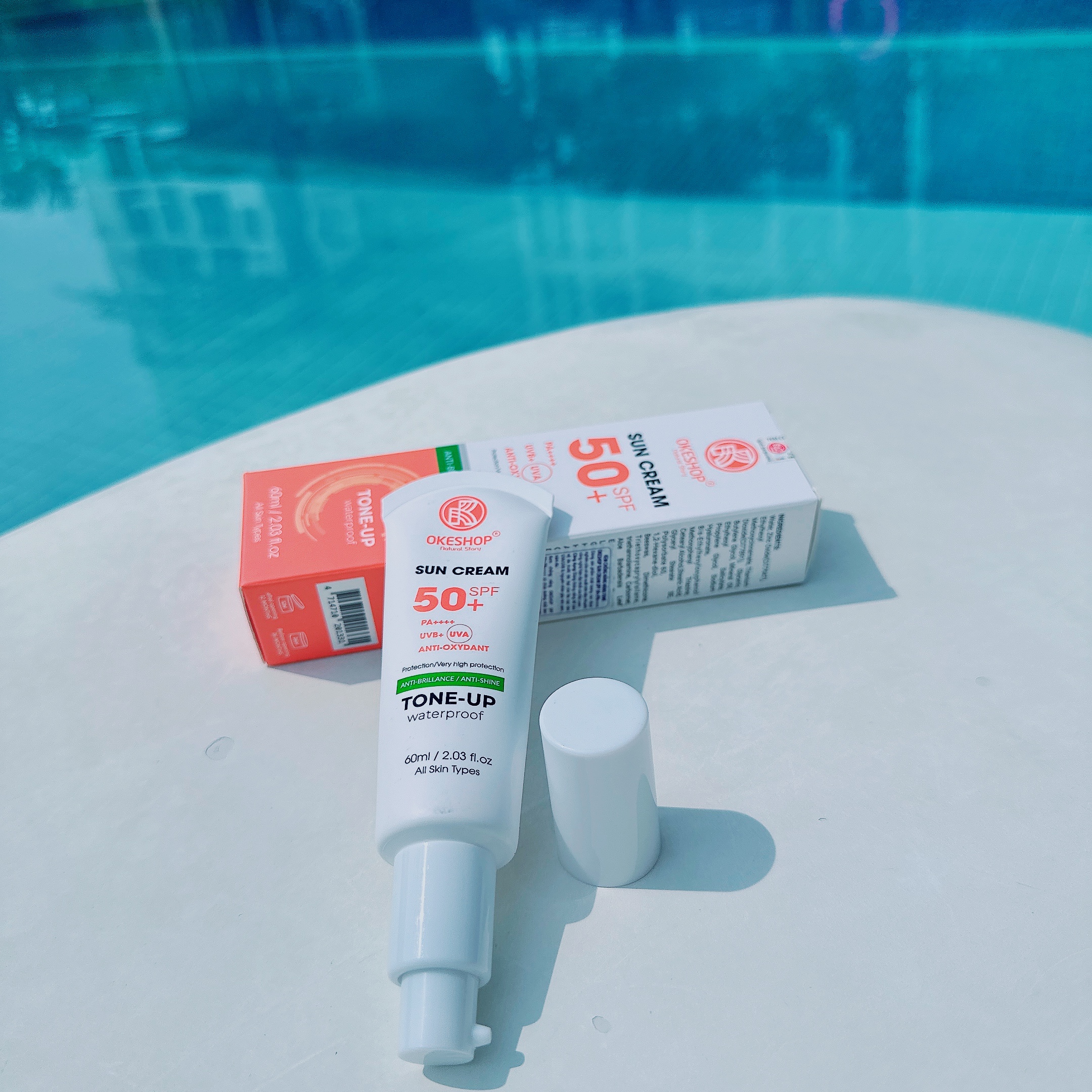 Một điểm cộng của TONE-UP OKESHOP SPF 50+ PA++++ Anti-oxydant 60ml nữa đó chính là khả năng chống thấm nước, mồ hôi và kể cả lượng dầu nhờn tiết ra trên da nên chúng ta không phải lo lắng lớp kem chống nắng sẽ bị trôi mất. Cũng chính vì tính năng thẩm thấu sâu vào bên trong bề mặt da nhanh chóng nên đây sẽ là sản phẩm lý tưởng để sử dụng mỗi khi đi tắm biển, bơi lội hay tiếp xúc môi trường nước.