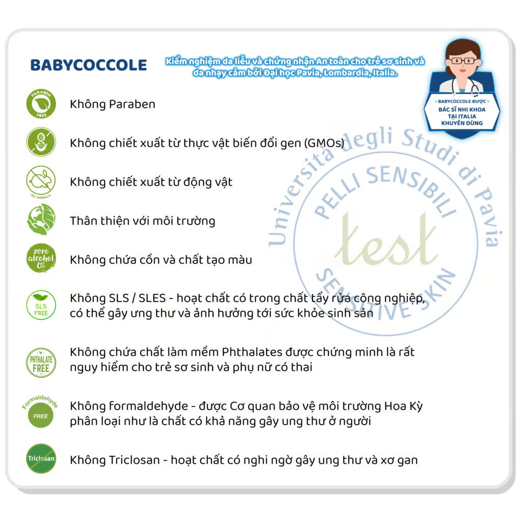 Được kiểm nghiệm da liễu, an toàn cho trẻ sơ sinh, mẹ bầu, cho con bú và da nhạy cảm. Sản phẩm được nghiên cứu và phát triển và sản xuất tại Ý.