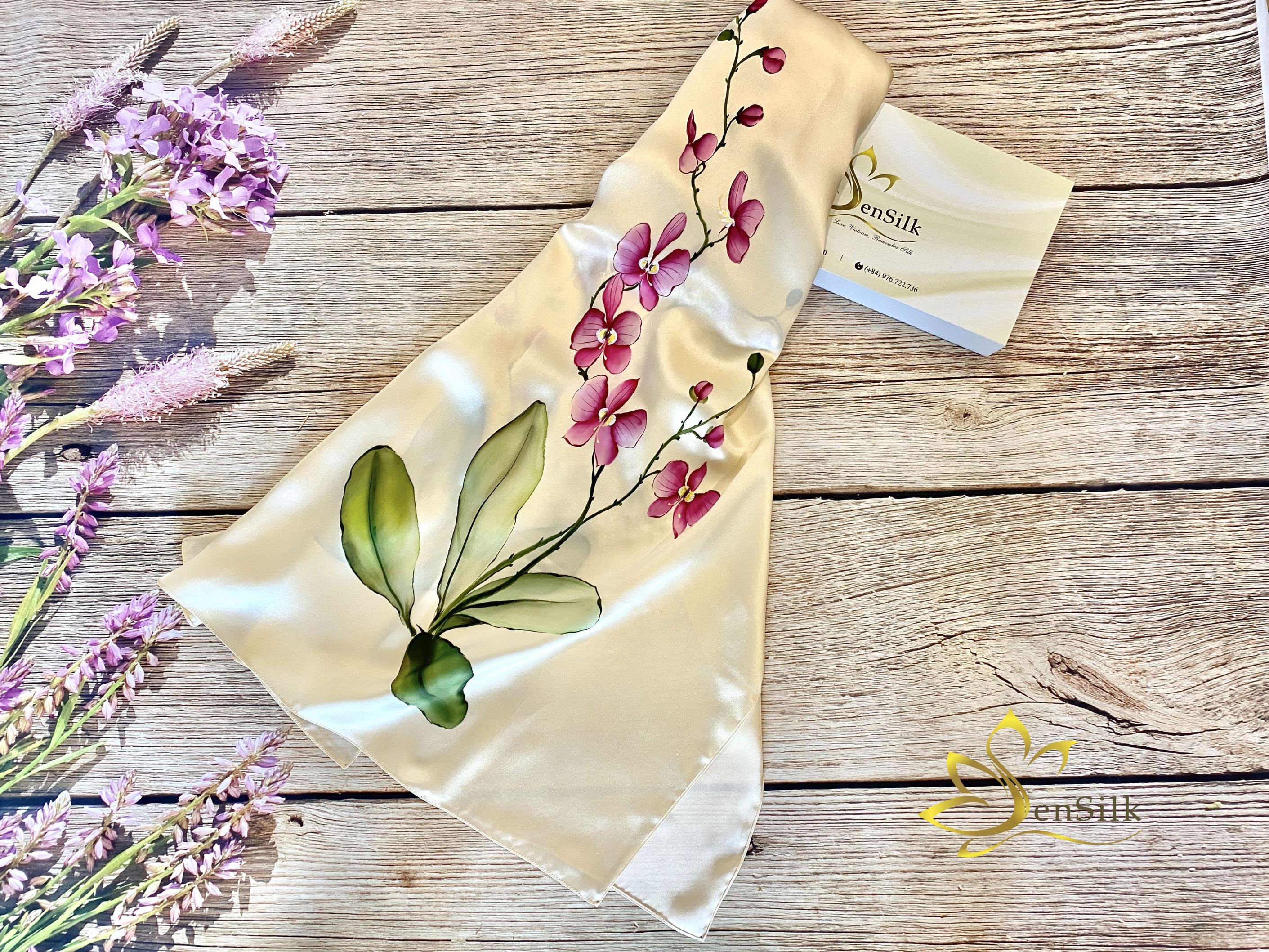 ✨Khăn Lụa Cao Cấp Vẽ Tay Hoa Lan SenSilk Limited – Quà Tặng Doanh Nhân 200x55cm, Vietnam Hand Painted Silk