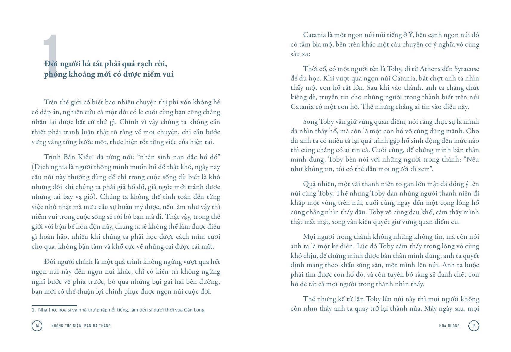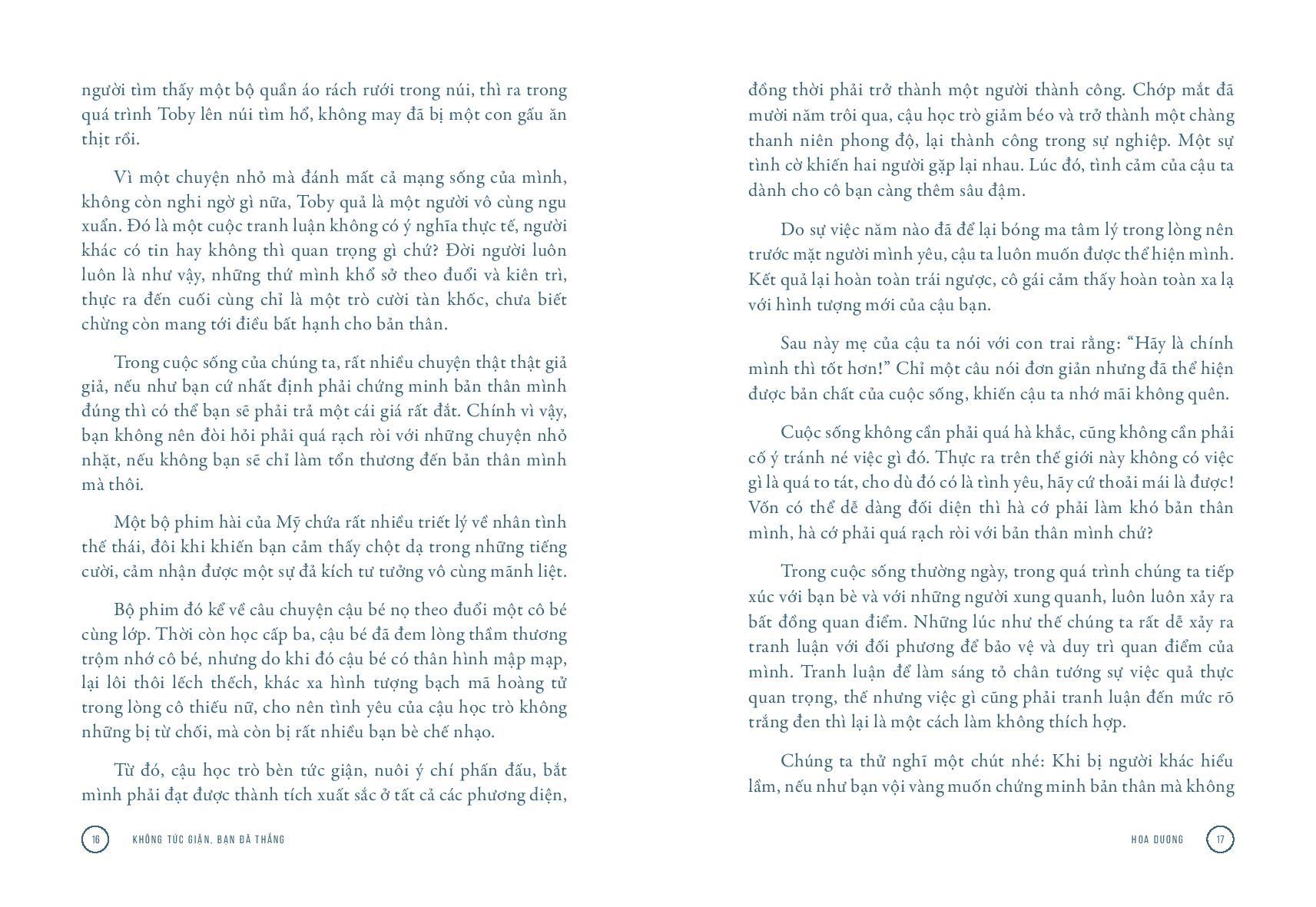 Không Tức Giận Bạn Đã Thắng Cuộc sống vốn là sự quay vòng của hỷ, nộ, ái, ố. Với người thiếu kỹ năng khi đối diện những tình huống bất trắc, bạn thường chọn cách gặm nhấm sự bực bội và chuốc lấy mệt mỏi. Nhưng thực tế, việc bạn tức giận là đang lấy sai lầm của người khác để trừng phạt chính mình.  Không tức giận, bạn đã thắng sẽ cùng bạn đi sâu vào từng ngóc ngách cảm xúc, thấu rõ mọi nấc thang của cơn giận. Từ đó, tìm ra điểm cân bằng cho tâm trạng, xoay chuyển thái độ và mài giũa khả năng kiềm chế cảm xúc, trở thành viên kim cương quý giá dưới những áp lực cuộc đời. Với góc nhìn đầy thấu đáo, tác giả Hoa Dương soi lăng kính qua từng vấn đề, từng sự việc, giúp bạn nhận ra việc cân bằng cảm xúc có mối tương quan trực tiếp tới từng thời khắc của cuộc đời mỗi người. Thay vì tức giận, nếu bạn lựa chọn một tâm thế, một góc nhìn lạc quan hơn, thì tất cả những khó chịu sẽ trở nên nhỏ nhặt. Chỉ cần bạn dũng cảm, lựa chọn đi theo mặt trời, cuộc đời tự nhiên sẽ tràn ngập ánh nắng và niềm vui.
