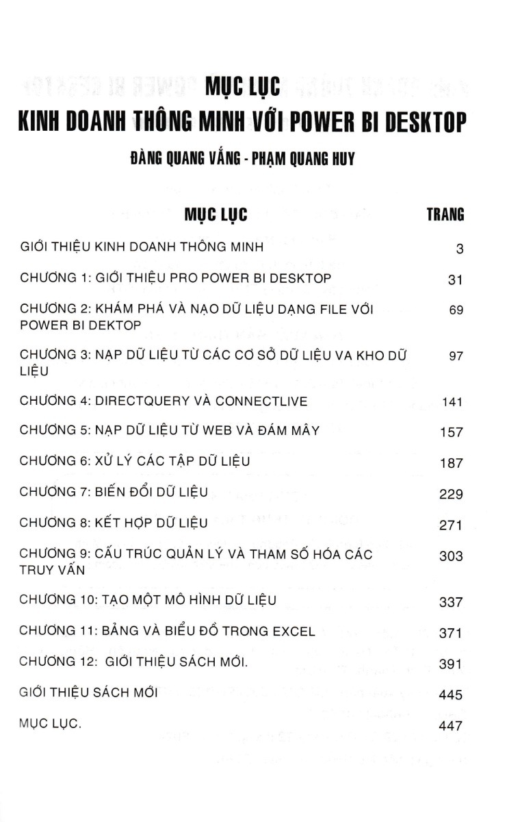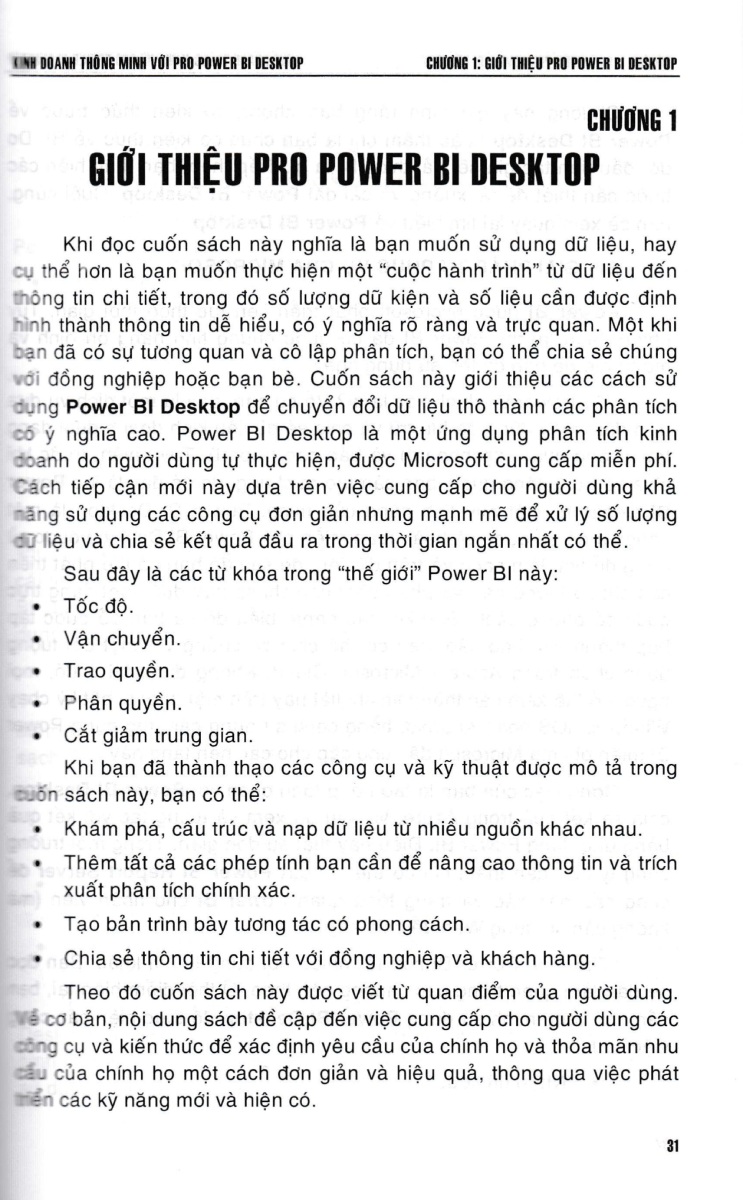 Cuốn sách này hướng dẫn người học cách sử dụng Pro Power BI Desktop của Microsoft. Người học sẽ nắm được cách biến các dữ liệu thô thành thông tin rõ ràng, chính xác và có tính tương tác. Tiếp đó, người học sẽ nâng cao kỹ năng sử dụng BI. Bạn đọc học cách tạo ra các trực quan hóa hấp dẫn, giúp người xem có thể dễ dàng tương tác. Bạn có thể thấy được cách chọn một trong số các công cụ tích hợp và các kiểu trực quan hóa bên thứ ba để làm nổi bật thông điệp. Bạn khám phá ra các cách để cung cấp những kết quả đó trên PC, trên máy tính bảng, trên smartphone, cũng như chia sẻ kết quả qua đám mây.