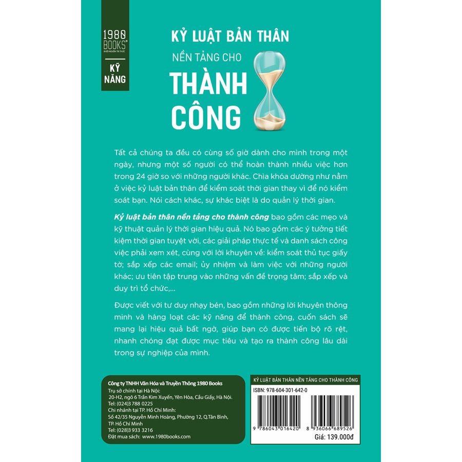 Cố tổng thống mỹ Benjamin Franklin từng nói: “Nếu thời gian là thứ đáng giá nhất, phí phạm thời gian hẳn phải là sự lãng phí ngông cuồng nhất.” Cuốn sách “Kỷ luật bản thân nền tảng cho thành công” sẽ mang đến cho các bạn các mẹo và kỹ thuật đã được chứng minh để giúp bạn xem xét và đánh giá việc quản lý thời gian của mình và áp dụng các phương pháp làm việc mới để cải thiện nó. Nó bao gồm các ý tưởng tiết kiệm thời gian tuyệt vời, các giải pháp thực tế và danh sách công việc phải xem xét, cùng với lời khuyên về: kiểm soát thủ tục giấy tờ; sắp xếp các email; ủy nhiệm và làm việc với những người khác; ưu tiên tập trung vào những vấn đề trọng tâm; sắp xếp và duy trì tổ chức. Cuốn sách có nhiều bài tập thực tế hơn, các vì dụ hữu ích và các mẹo hàng đầu để giúp bạn giảm thiểu sự lãng phí và gián đoạn thời gian, đồng thời tập trung vào các ưu tiên sẽ dẫn đến thành công trong công việc và sự nghiệp của bạn. “Kỷ luật bản thân nền tảng cho thành công” sẽ cung cấp cho bạn các công cụ để trở nên hiệu quả và hiệu quả hơn.
