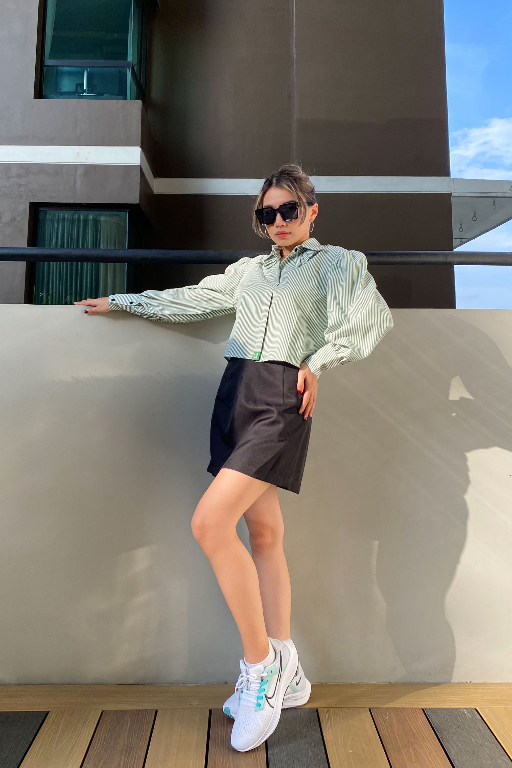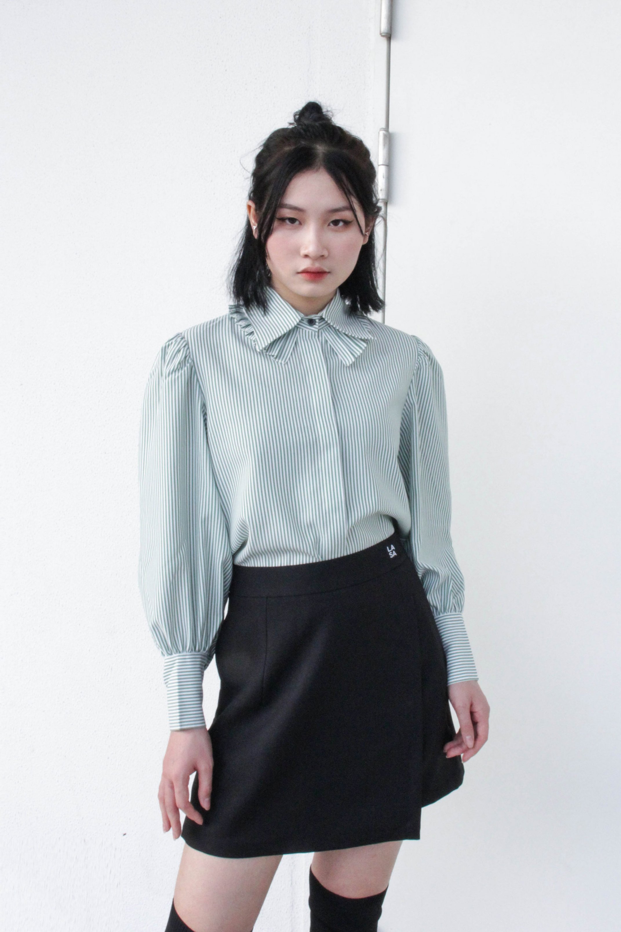 CHẤT SOMI COTTON PHA, MỀM ĐỨNG PHOM ÁO MÀU XANH LÁ SỌC TRẮNG ÁO CỔ SOMI KIỂU, TAY PHỒNG, NẸP ÁO GIẤU NÚT PHOM ÁO CROPTOP ĐIỂM NHẤN PHẦN XẾP LY Ở LÁ CỔ PHẦN DƯỚI, TẠO THÀNH LÁ CỔ 2 LỚP CÁCH ĐIỆU