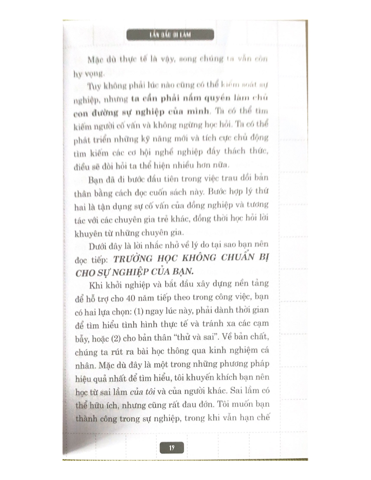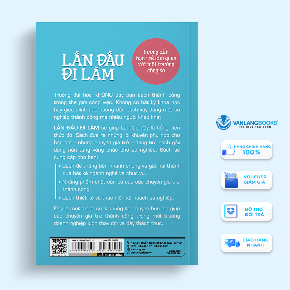 Lần Đầu Đi Làm-Vanlangbooks I.Giới thiệu sách Trường đại học KHÔNG dạy bạn cách thành công trong thế giới công việc. Không có bất kỳ khóa học hay giáo trình nào hướng dẫn cách xây dựng một sự nghiệp thành công mà nhiều người khao khát. "Lần Đầu Đi Làm" sẽ giúp bạn lấp đầy lỗ hổng kiến thức đó. Sách đưa ra những lời khuyên phù hợp cho bạn trẻ – những chuyên gia trẻ – đang tìm cách gầy dựng nền tảng vững chắc cho sự nghiệp. Sách sẽ cung cấp cho bạn: