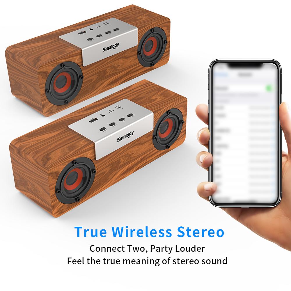 Adopting wooden material, SMALODY SL-90H wooden BT speaker is elegant and fashionable. It uses advanced BT 5.0 technology, effectively lower energy consumption and provides stable transmission. With 4*5W loudspeakers of 64mm large diameter, it can