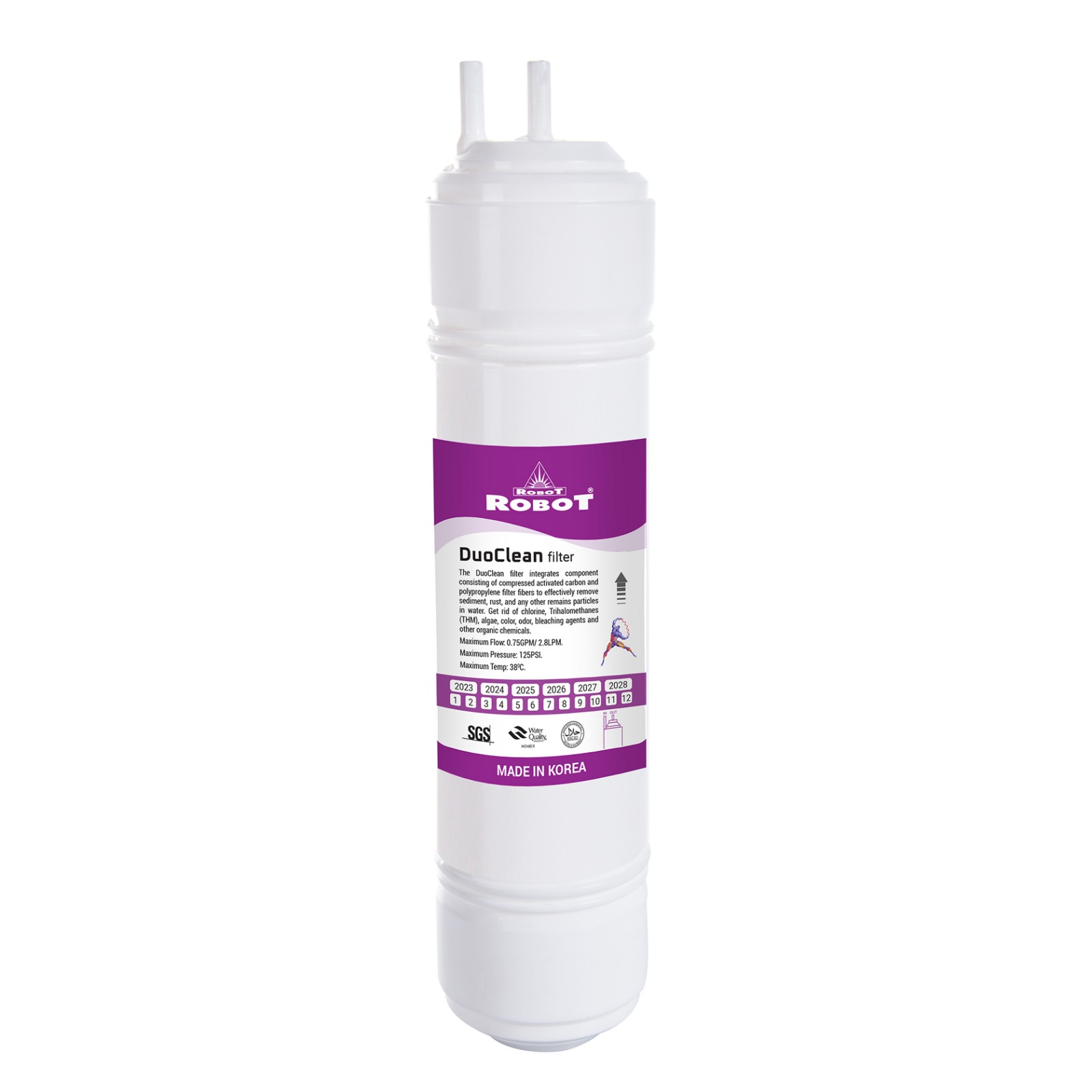Lõi lọc DuoClean tích hợp 2 trong 1 gồm than hoạt tính dạng nén và sợi lọc Polypropylen loại bỏ hiệu quả cặn bẩn, rỉ sét và các hạt lơ lửng trong nước, loại bỏ clo, Trihalonmethanes (THM), rong rêu, loại bỏ màu sắc, mùi, chất tẩy trắng và các hợp chất hữu cơ khác