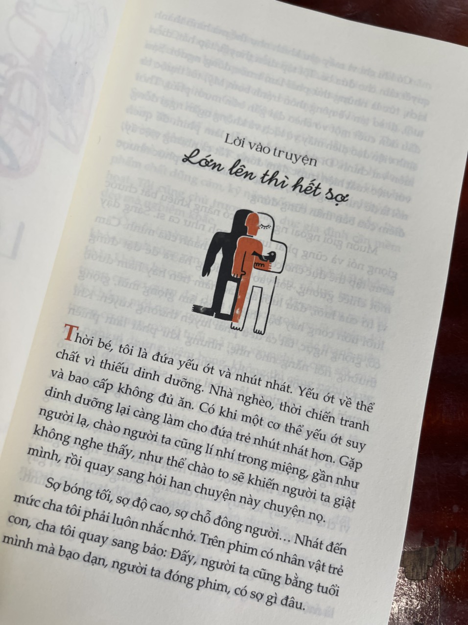 “Trong cuốn sách này, tôi chia sẻ một ít kỉ niệm đã xa, ngoảnh lại nhìn qua màn sương ký ức để thấy lại mình thời thơ bé. Khi còn nhỏ, tôi từng sợ rất nhiều thứ, nhưng tôi lớn lên không còn sợ đám đông, không sợ bóng tối, không còn sợ độ cao.” – Nhà văn Hồ Anh Thái.