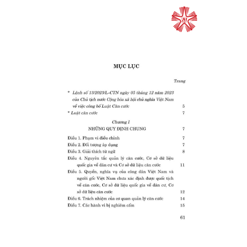 Luật Căn cước năm 2023 được Quốc hội khóa XV, kỳ họp thứ 6, thông qua ngày 27/11/2023, gồm 07 chương, 46 điều, quy định về: cơ sở dữ liệu quốc gia về dân cư, cơ sở dữ liệu căn cước; thẻ căn cước, căn cước điện tử; giấy chứng nhận căn cước; quyền, nghĩa vụ, trách nhiệm của cơ quan, tổ chức, cá nhân có liên quan. Luật có hiệu lực thi hành từ ngày 01/7/2024, trừ trường hợp quy định tại khoản 3 Điều 46.